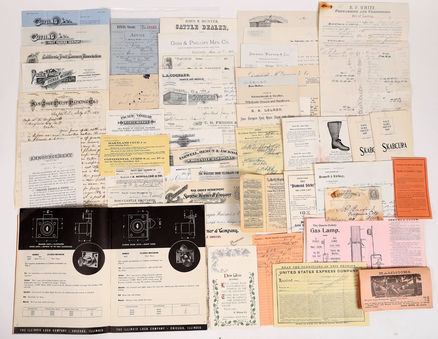 Assortment of about 50 US letterheads, billheads, catalogs, gas lamps instructions, Pacific Coast Steamship, nuts, hardware etc. Mostly late 1800's.