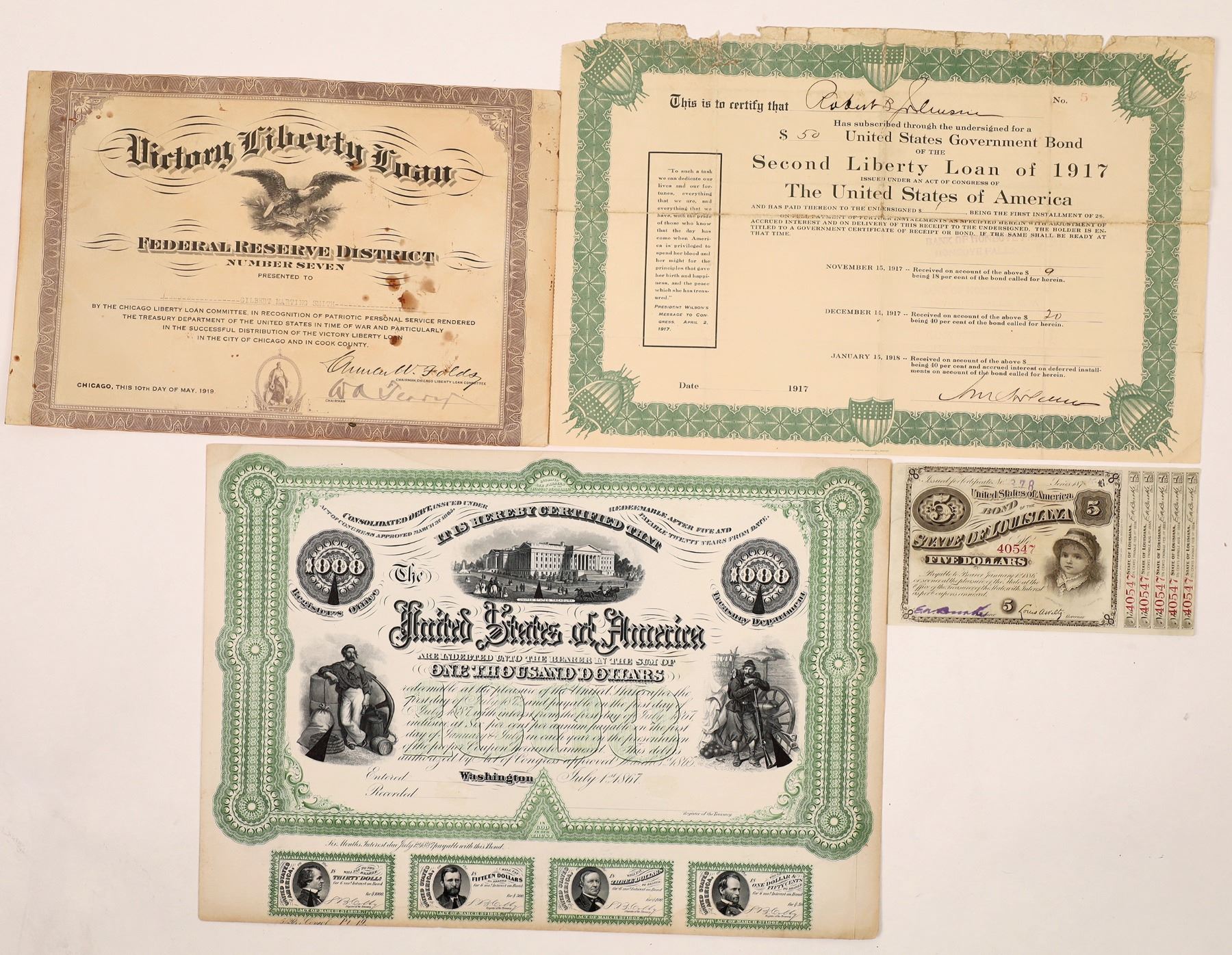 Lot of 4 different. 1) Rare 1867 Printers Proof of a $1,000 US Loan Bond. Green border, black print, and multiple vignettes including the US Treasury, a sailor, a hunter, and famous Americans including US Grant. 9 x 13" Printed on thick paper. Toning. 2) $5 State of Louisiana Bond, 1880s. 3 x 5.75" 3) $50 Second Liberty Loan of 1917. Bond No. 5. WW I. 8 x 12" Folds, toning, ripped edges. 4) Victory Liberty Loan. 1919. 6.75 x 10" Soiling, toning.