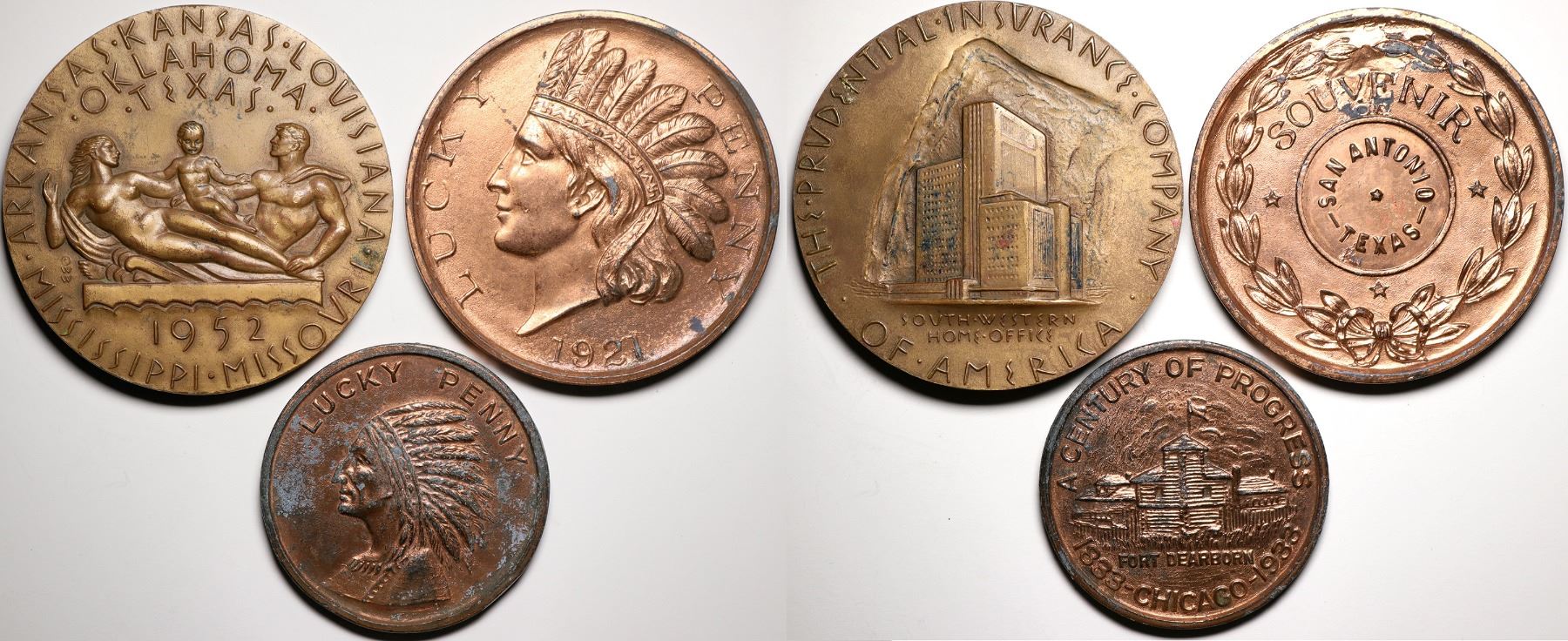 Two "lucky" oversize Indian Head lucky penny/Century of Progress/Fort Dearborn/1833 -Chicago-1933, 2.25" diam.; Indian Head Lucky Penny/1921//Souvenir/San Antonio/Texas, 2 7/8" diam; The Prudential Insurance Company/of America/South Western/ Home office// Arkansa, Kansas, Louisiana/Oklahoma/Texas/1952/Mississippi, Missouri; bronze. 3" diam, Medallic Arts Co, edge.