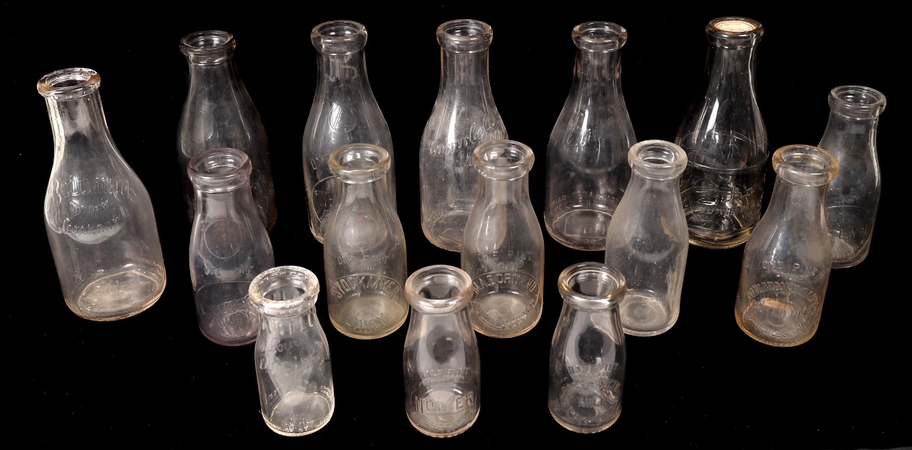 15 US milk bottles, round and embossed. MN, OH, NY etc. 6 quart, 6 pint, 4 half pint. See photo.