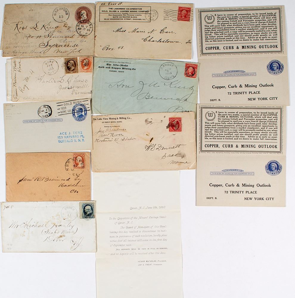 10 pieces include: 1837 letter and cover regarding sinking a new mining shaft and putting in a new boiler and pump; letter (notice) and cover of bank closing. The Miners' Savings Bank to Michael Hanley Teabo Mine, New Jersey, 1880; 3 covers with corner mine advertisements; 3 postal cards; two 1884 letters with covers. State: United States City: Date: FHWAC#: 37427