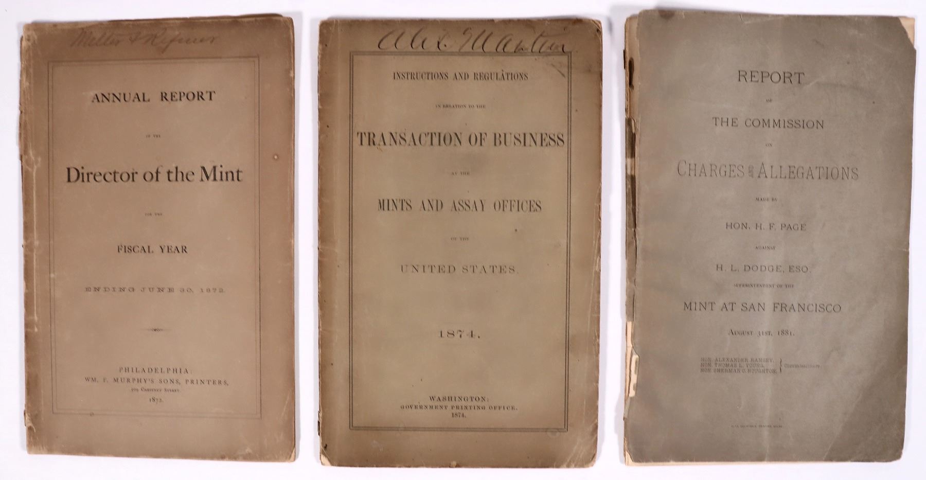 Annual Report of the Director of the Mint 1872. Transaction of Business of the Mint and Assay Offices,1874. Report of the Commission of Charges and Allegations Made by HON. H F Page Against H L Dodge Esq. 1881-related to the 1880 firing of employees at the San Francisco Mint and charges resulting versus the Mint Superintendent as politically motivated, and receiving Northern Belle bullion that was below 900 fines. All have some condition issues, please inspect.