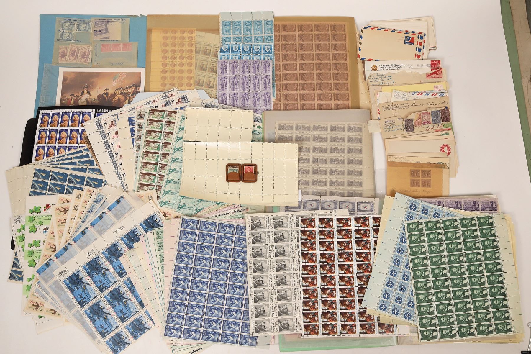 US mint sheets of commemorative stamps with a face value of about $418. Also about 25 covers and postcards.
