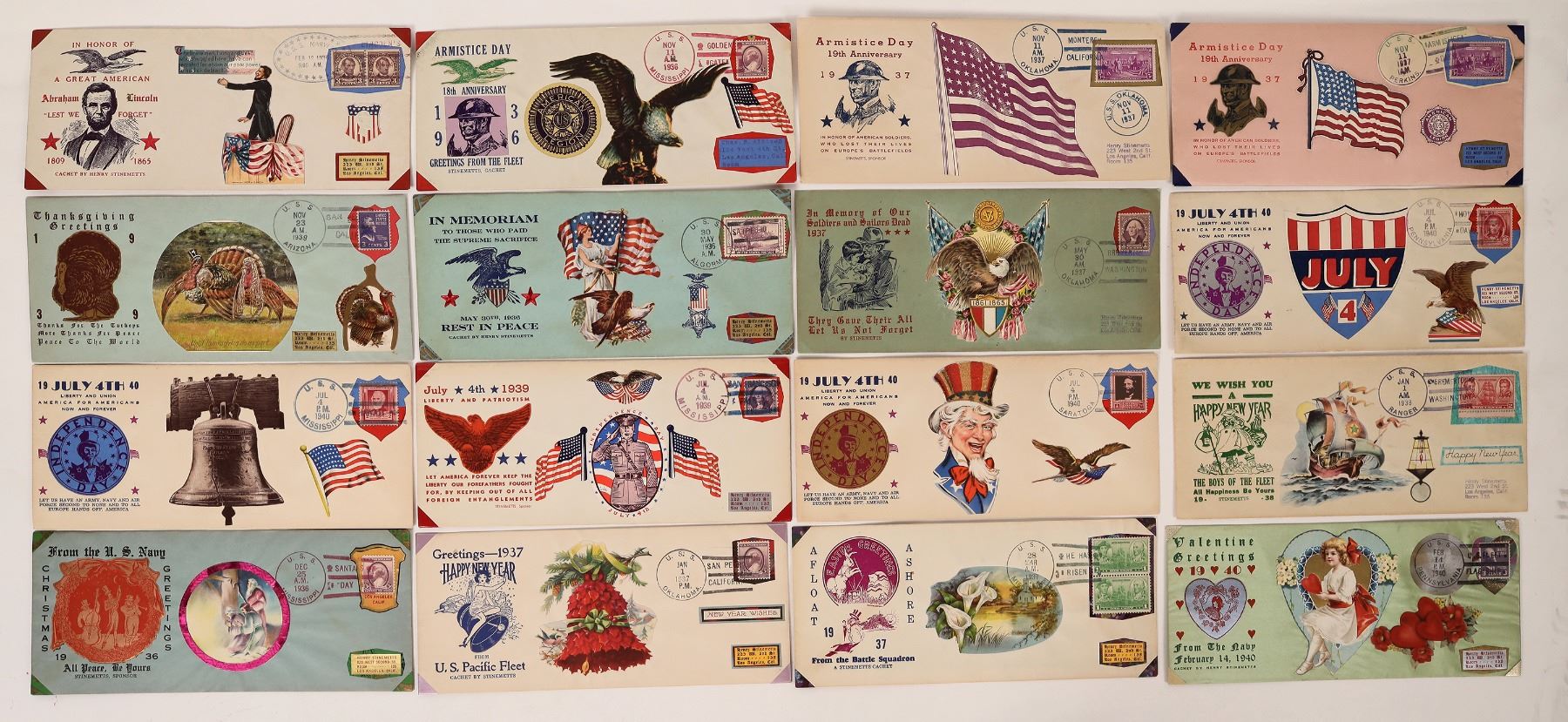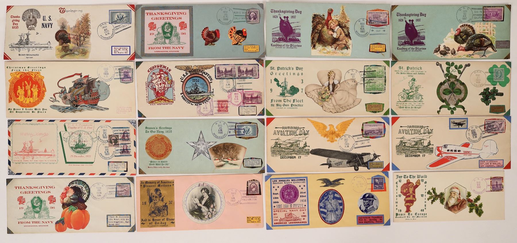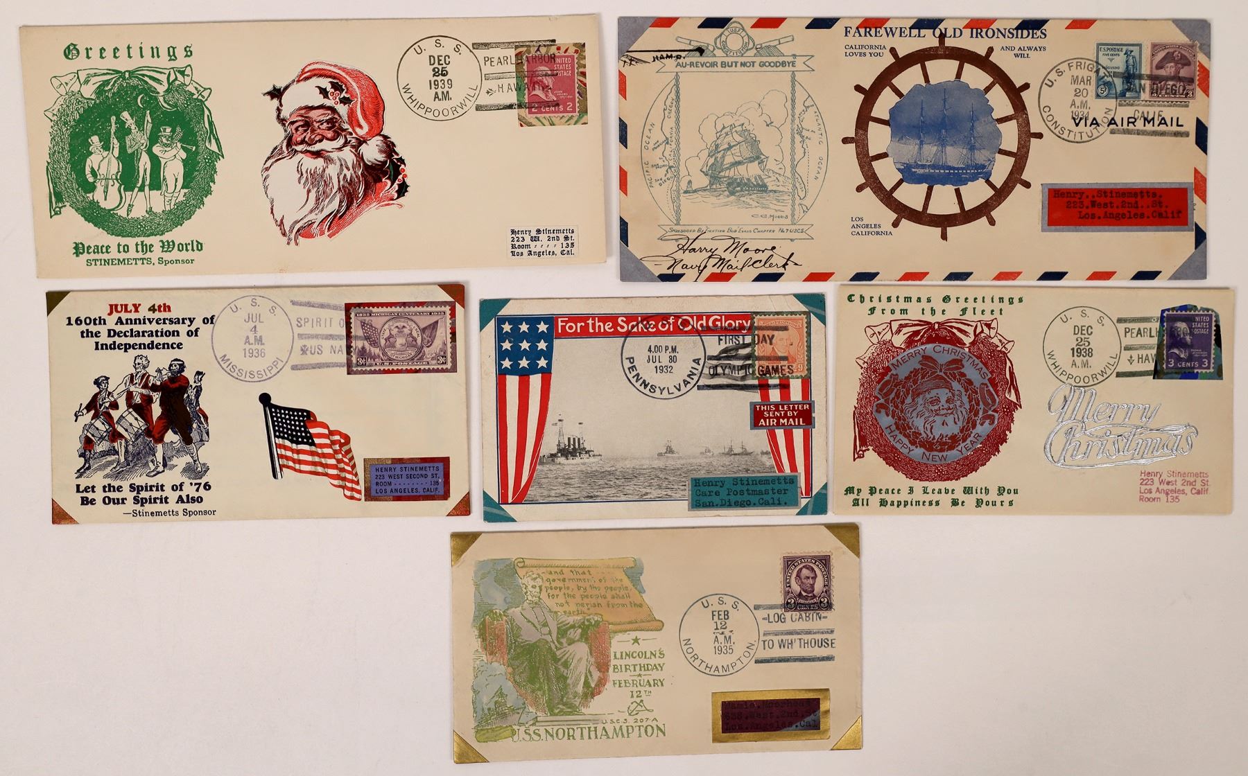 37 all unique hand made cachet US Naval covers by Henry Stinemetts, all with US Fleet cancels including USS Arizona, 1932 First Day of Olympics etc., c. 1930's. 4.25x9.5".