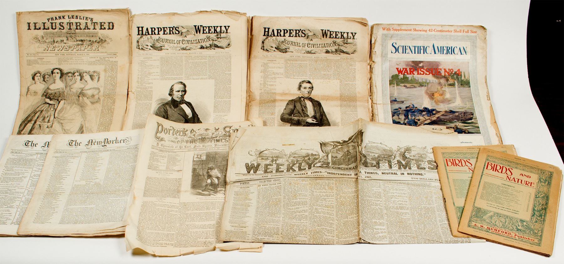 Lot of 10 pieces. Includes: two different copies of the New Yorker published in 1840 by Horace Greeley & Co. (prolific publisher, congressman, and passenger in famous Hank Monk stagecoach ride); two 1904 issues of Birds & Nature (with color illustrations); 1868 issue of The Cincinnati Weekly Times; Frank Leslie's Illustrated Newspaper (1858), Harper's Weekly (three different 1858); and a 1914 World War I War Issue No. 4 of Scientific American. There are serious condition issues to some of the pieces. Please inspect. State: City: HWAC#: 43514 Date: 18401-1914