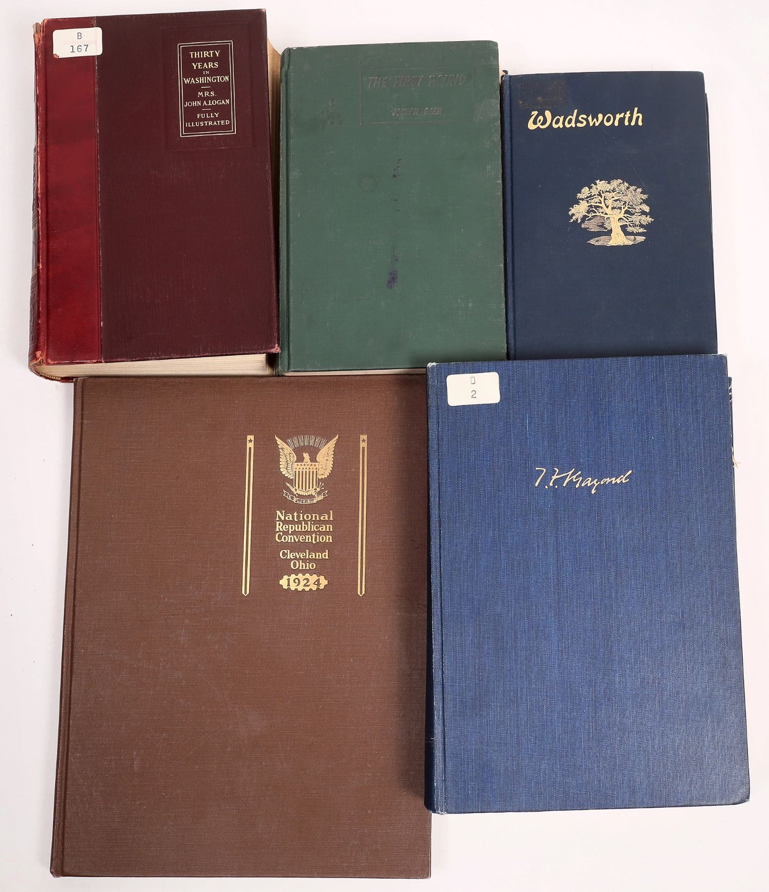 The First Round by Gaer 1944. Wadsworth of the Charter Oak by Gogher 1904-attractive binding. Thirty Years in Washington by Logan 1901. The Foreign Policy of Thomas F Bayard by Tansill 1940. National Republic Convention, Cleveland, Ohio 1924 with signed letter from Governor Jos. M Dixon affixed.