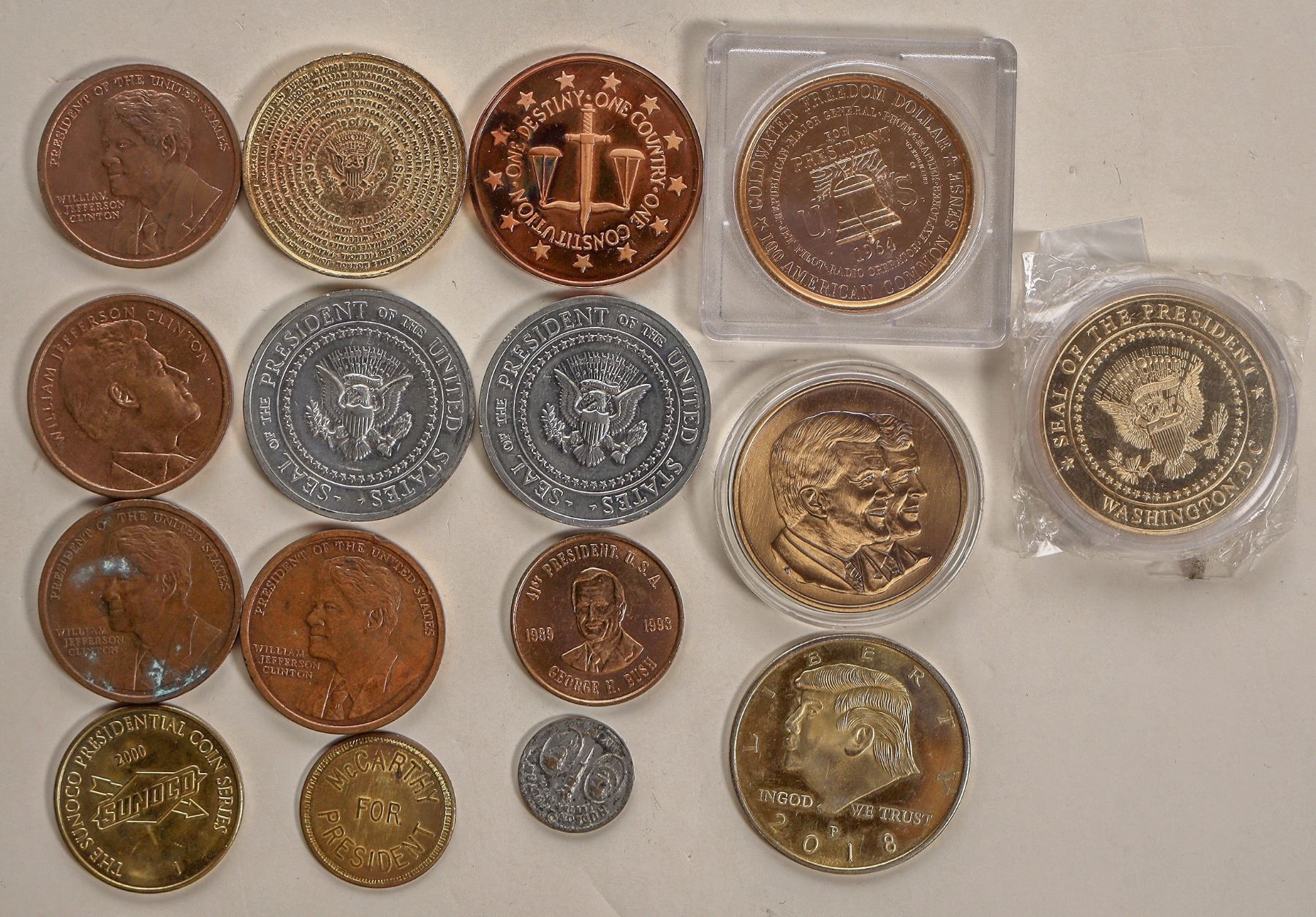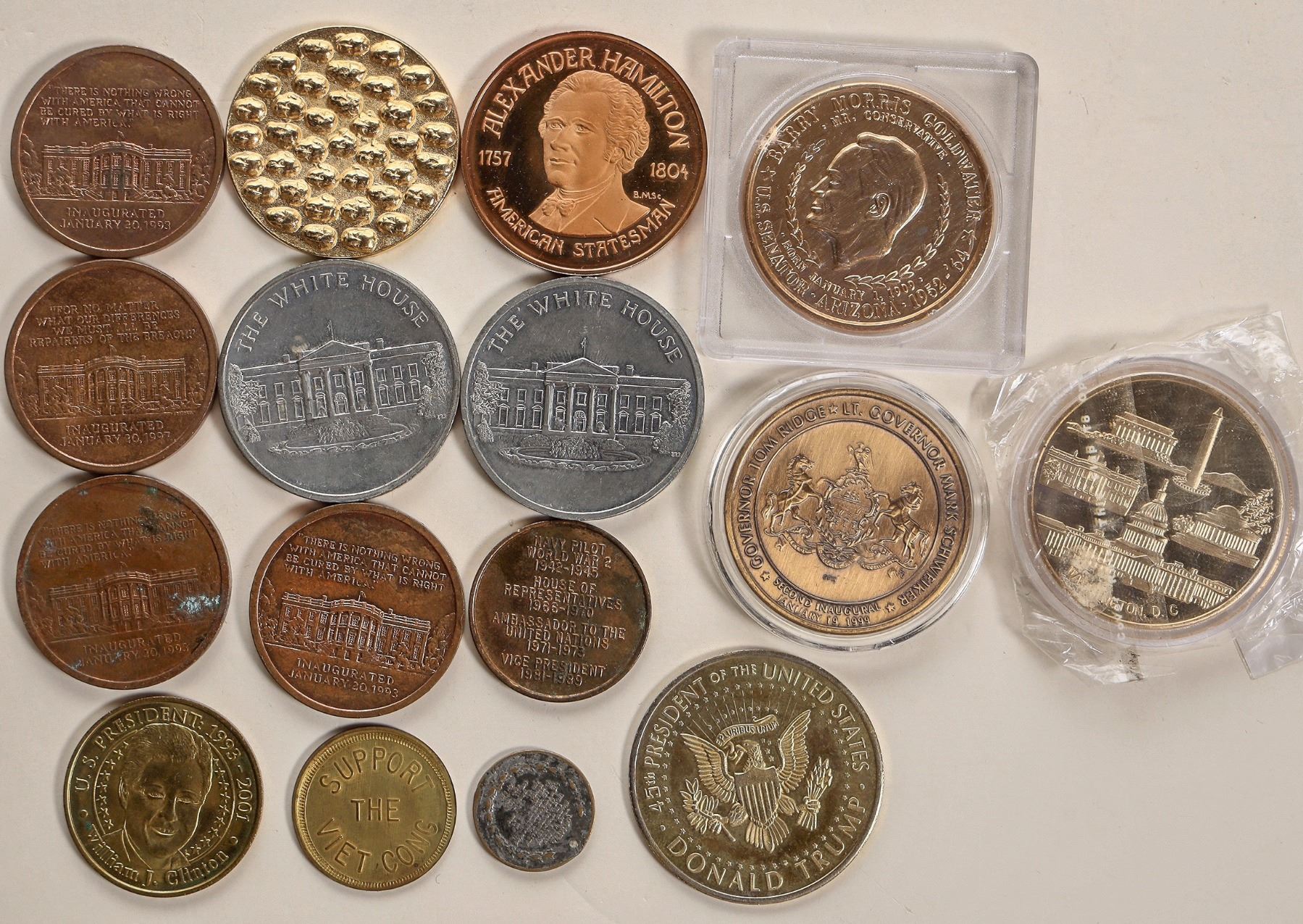 Misc. U.S. Political Coins. Various Conditions. Most in a protective seal. Includes: Clinton coins, Trump coin, Alexander Hamilton Coin, George Bush Coin.