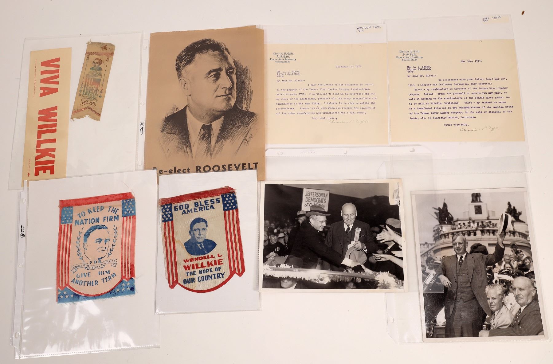 Lot of 9. Includes: B&W photos of Governor Alf M. Landon on the campaign trail; silk ribbon for Wendell Willkie campaign; silk ribbon for FDR campaign; 1892 Columbus Day ribbon; Viva Willkie sticker; Re-elect Roosevelt illustration; and two typed and signed letters from Charles Taft, son of President Taft, 1914 and 1915.