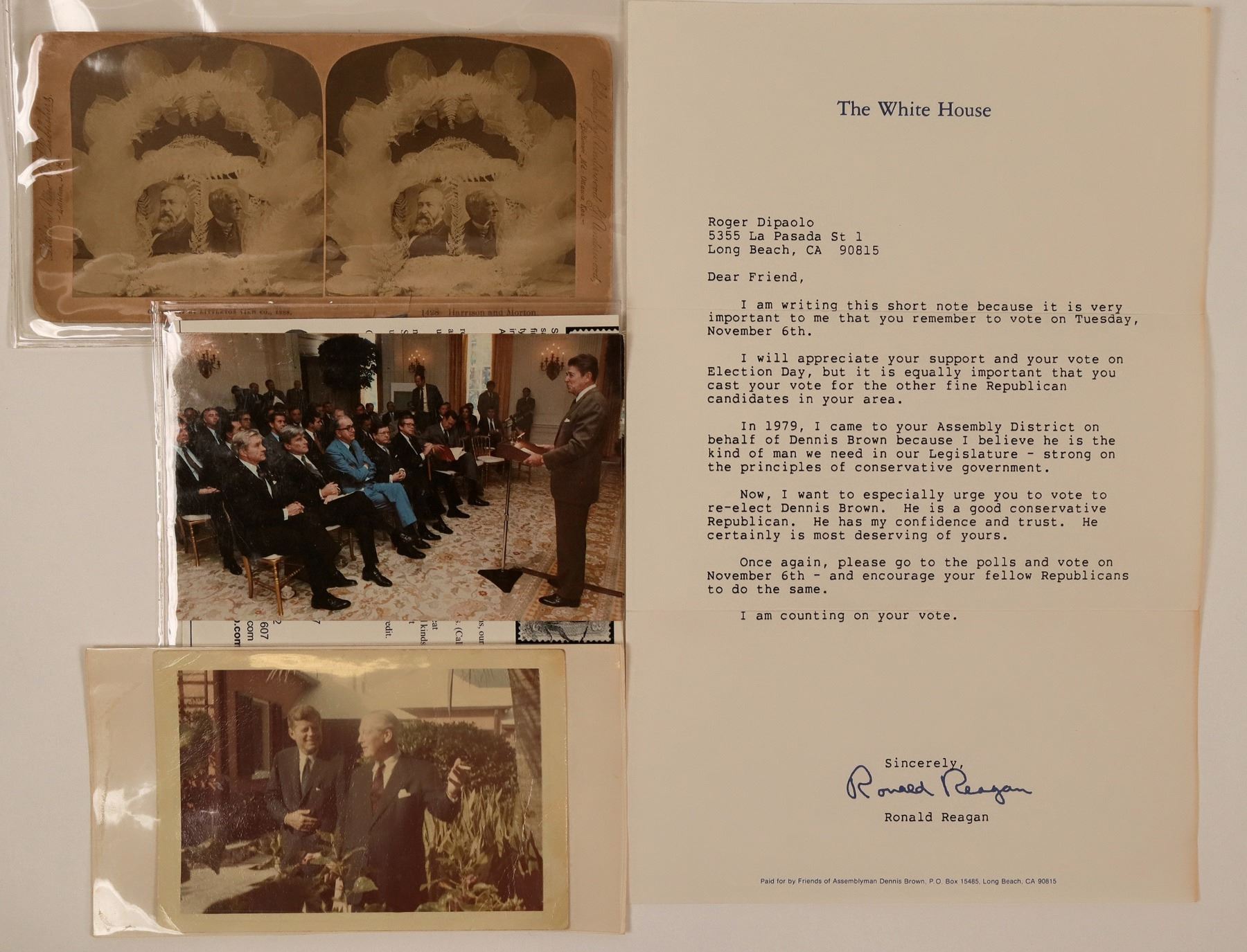 Lot of four U.S. president-related items, includes a cabinet card from the 1888 presidential election, featuring Republican Benjamin Harrison with running mate Levi P. Morton. Harrison lost the election to Grover Cleveland. Also are a 1981 color RPC Postcard of Ronald Reagan addressing senators, an undated election year correspondence with Reagan's autograph, and color photograph of John F. Kennedy and British Prime Minister Harold MacMillan in Bermuda, 1962.