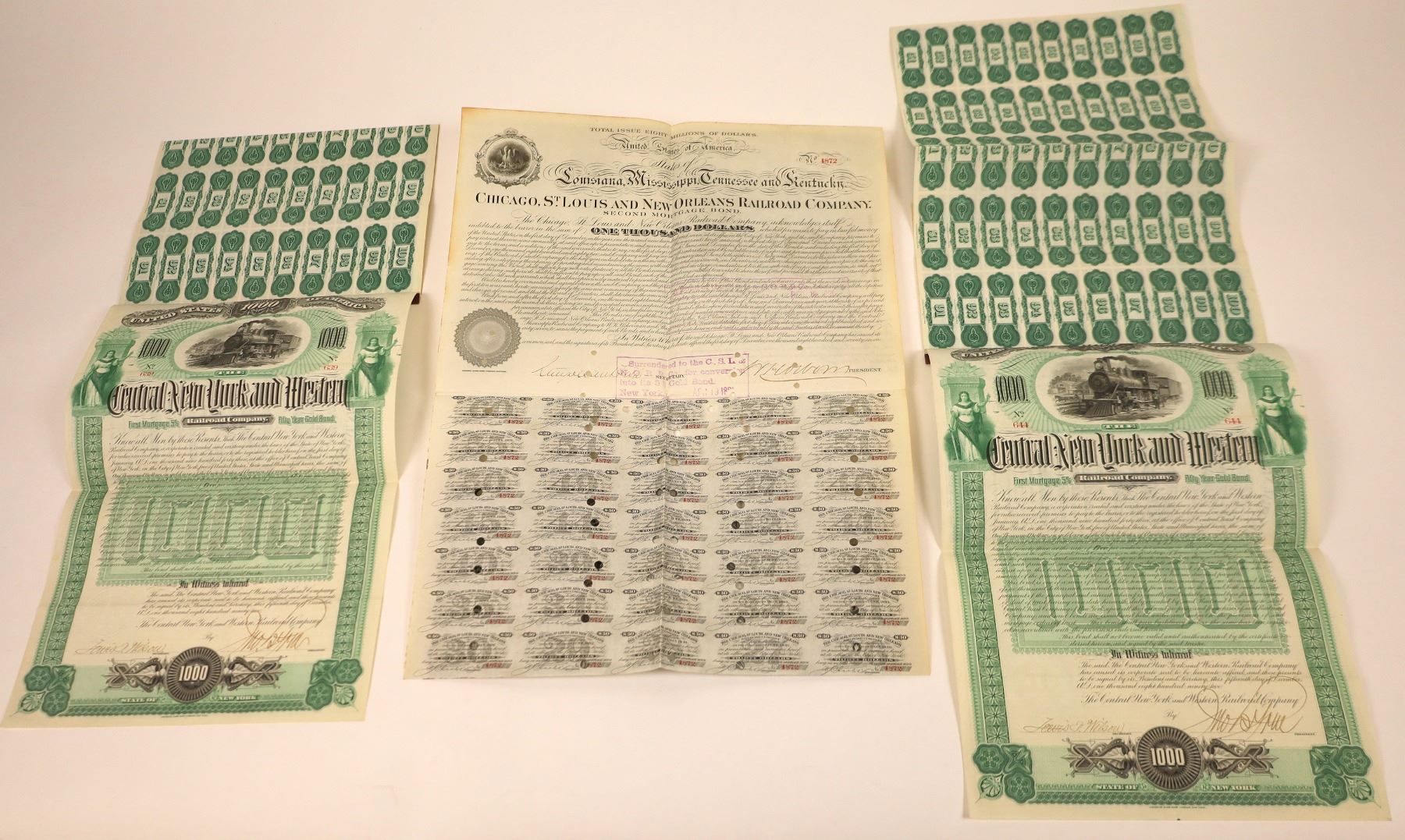 Lot of 9. 1) Lykens Valley Rail Road & Coal Company. Two stocks, issued in 1859 and 1861, pen cancelled. 2) Cayadutta Electric Railroad Company. One stock issued in 1893, pen cancelled. 3) Chicago, St. Louis & New Orleans Railroad Company. $1,000 bond issued in 1877, punch cancelled. 4) Central New York & Western Railroad Company. Five bonds issued in 1892. Not cancelled.