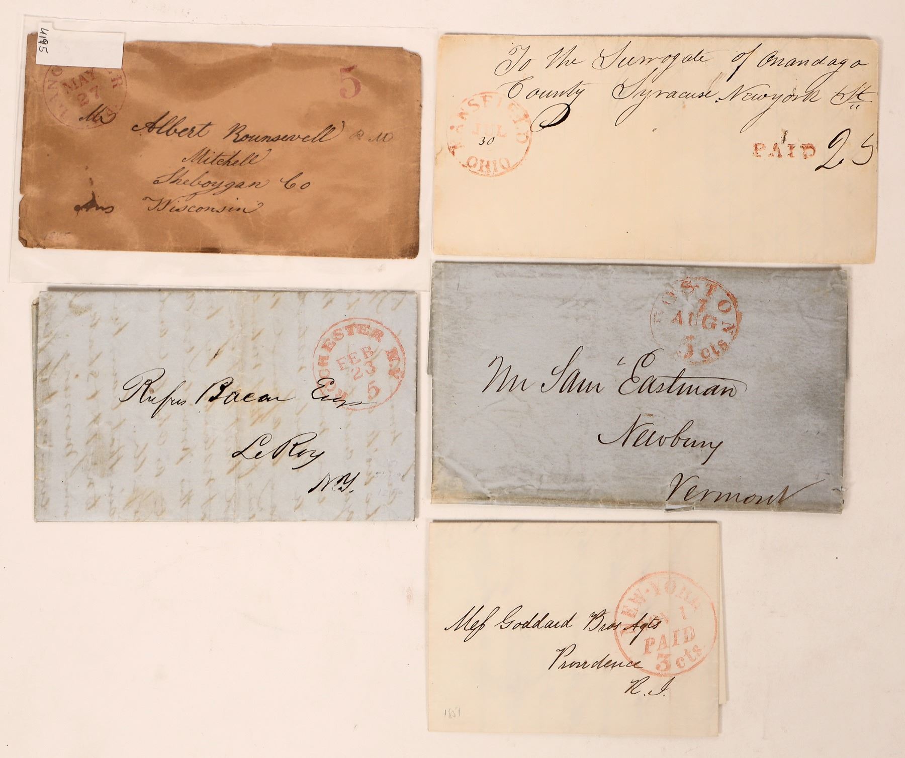 5 c. 1850-51 red cancels on US covers in this popular collecting field. Boston 5c in circle. Rochester, NY 5c in circle. Lancaster, PA-paid 5. Mansfield, OH-paid 25. New York, paid 3c in circle._x000D_