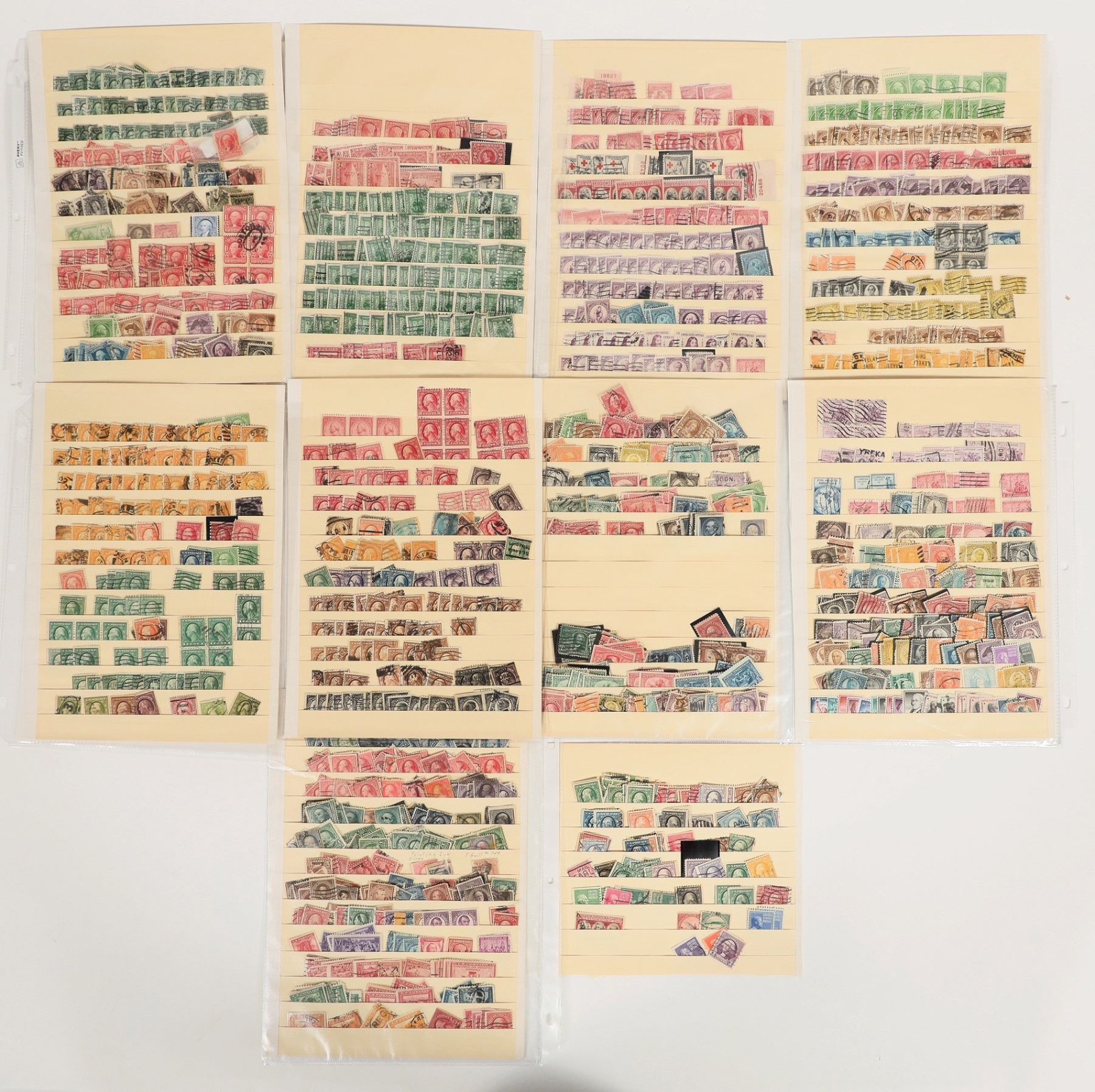 US regular issues/stock stamps. Approximately 100 stamps in each sheet protector, 10 sheet protectors of stamps. About 1,000 stamps total. See photo.