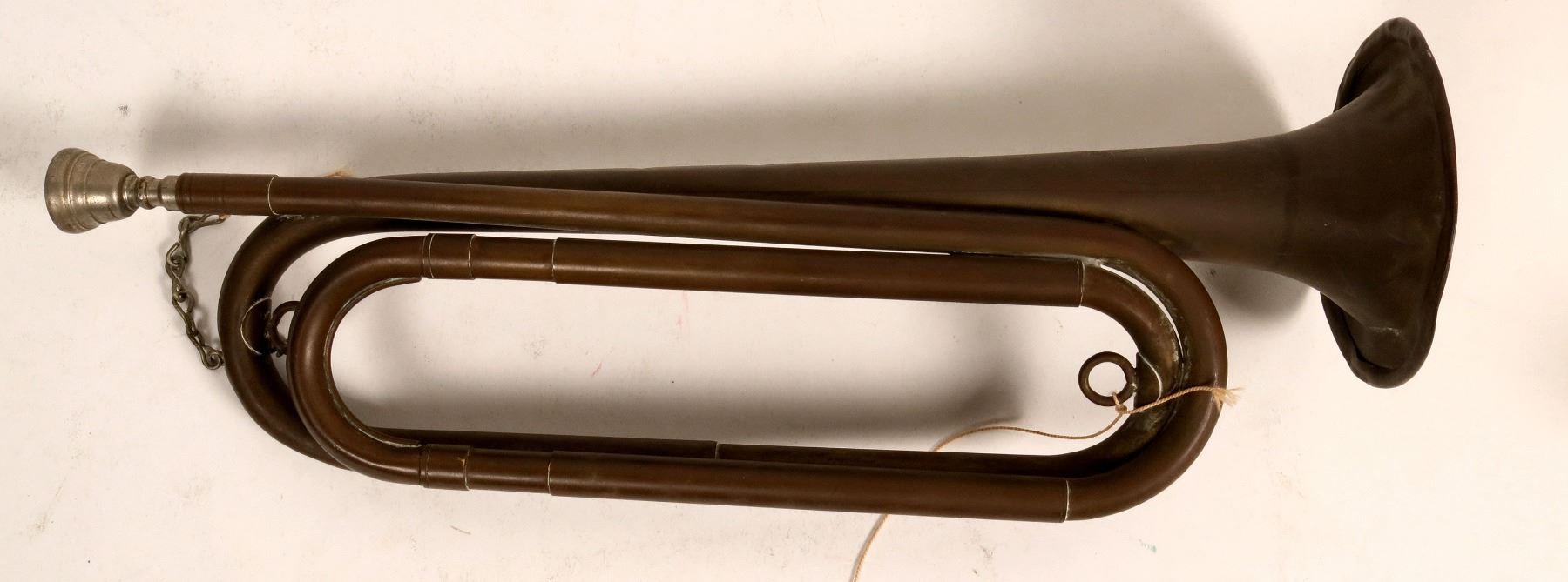 This is a US Army Rexcraft regulation bugle. No attempt has been made to clean or remove patination from this horn. It is marked "Rexcraft" in Gothic script followed by "made in the USA". The original chain for the mouthpiece is intact. 16 in. overall length. Dented bell.