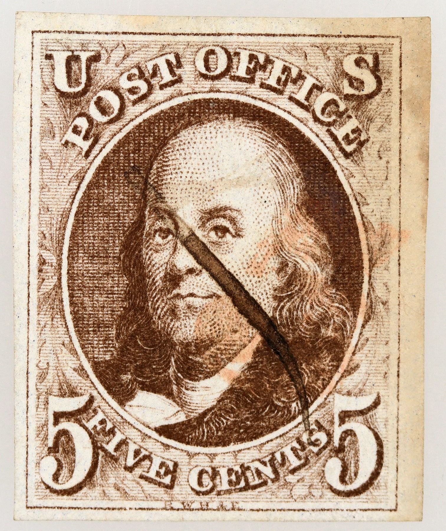 Nicely centered US stamp #1a, dark brown. The first US 5c. M5 cancel thru center.