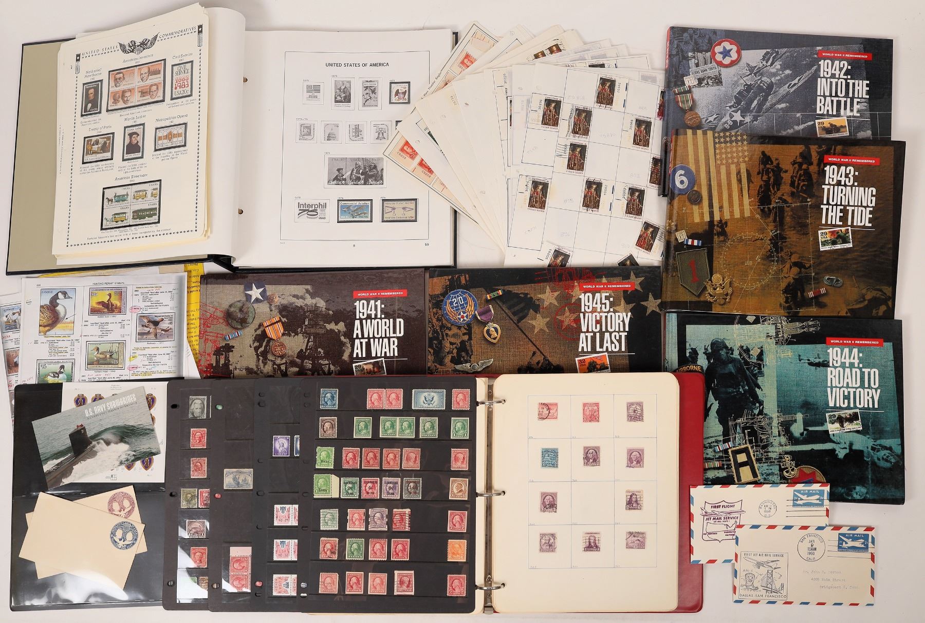 Nice group of US stamps. 5 WW2 Remembered US Postal Sets with books, album with mint post 1930's-no rarities, envelope with US Christmas stamp study group with perhaps hundreds of singles etc. all with plate numbers, arrows sheet edge markings etc. An interesting group. Red all US notebook with US coils(some line pairs) and various singles. Envelope with some better US singles. See photos.