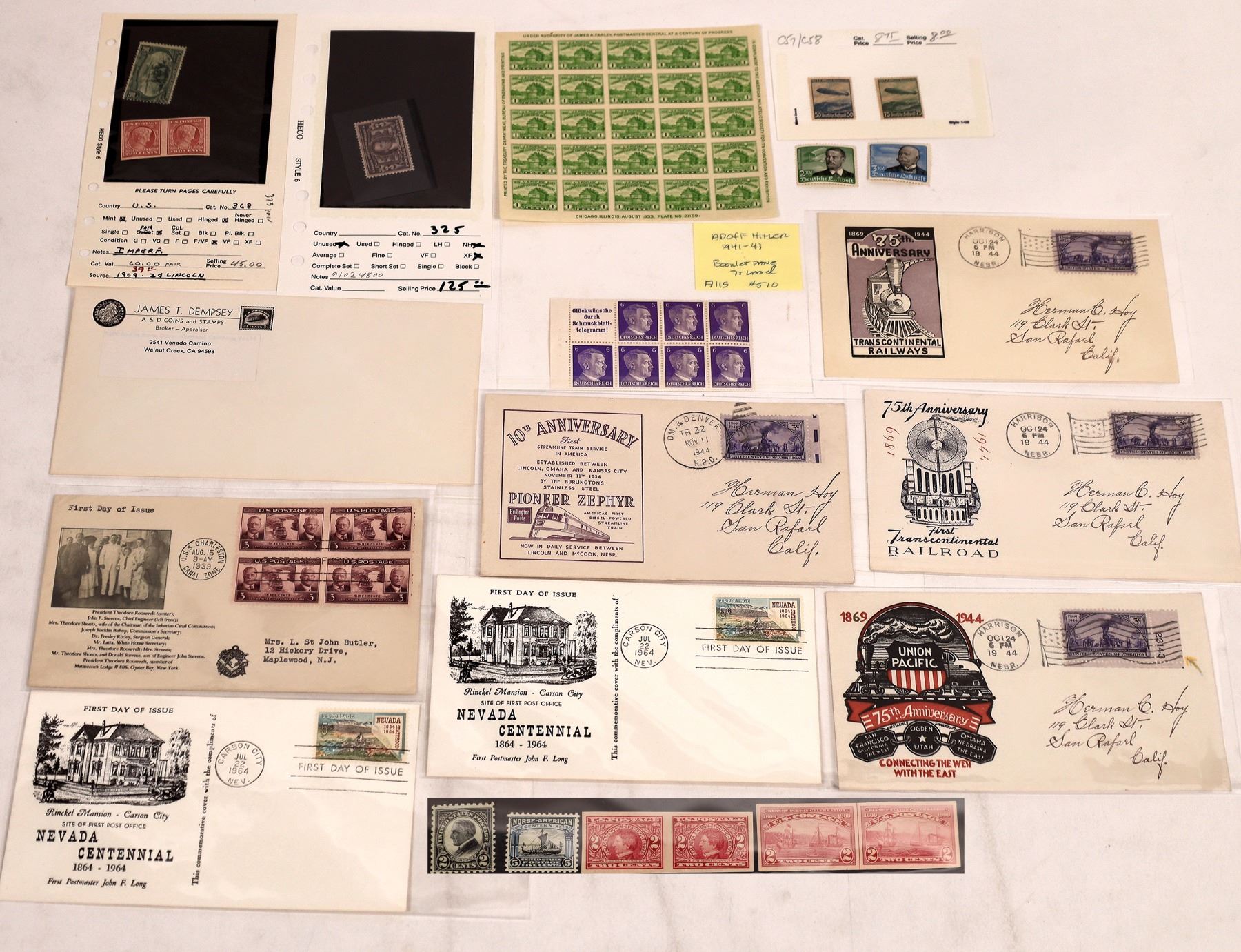Small group of some slightly better mint US. Scott 371 imperf pair; Scott 373 imperf pair; Scott 368 imperf pair; Scott 730 souvenir sheet; Scott 325 in XF and several others plus a few first day covers and a few German WW2 examples, such as C57/C58, C55 and A15 booklet pane (Hitler) State: City: Date: Provenance: