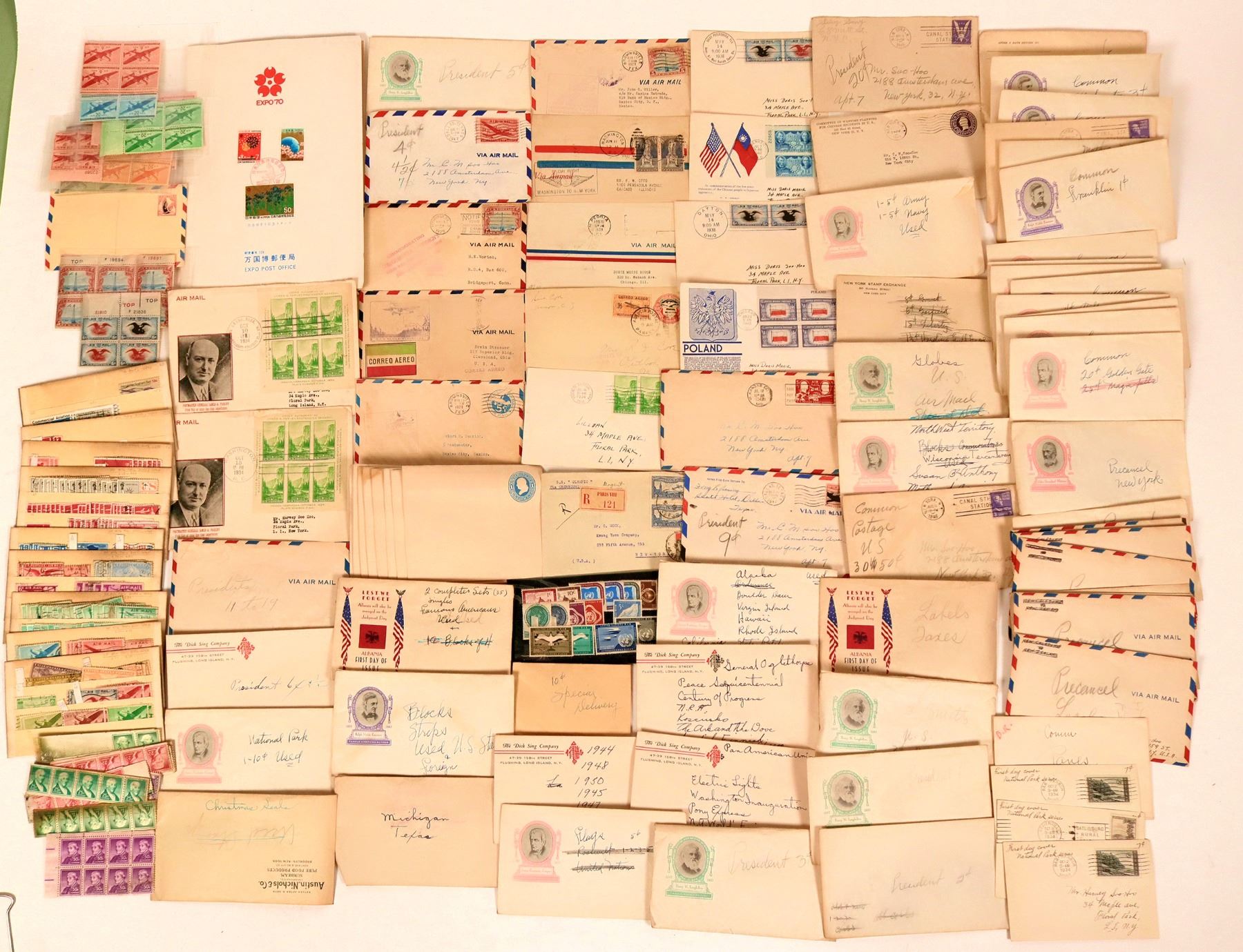 Pre-1947 US stamp hoard.About 50 envelopes with regular issues, commems, air mails, postage due, precancels, special delivery, etc. Mostly 1930s. Contains some unused (mint) as well as some damaged unused, such as block of $5 Hamilton (no gum); unused blocks of airmails (some plate blocks). Thousands of stamps.