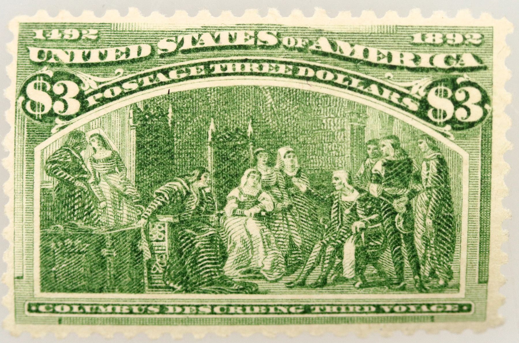 US stamp Scott 243, $3 green Columbian, well centered, F-VF. Original gum NH. Catalog $2400.