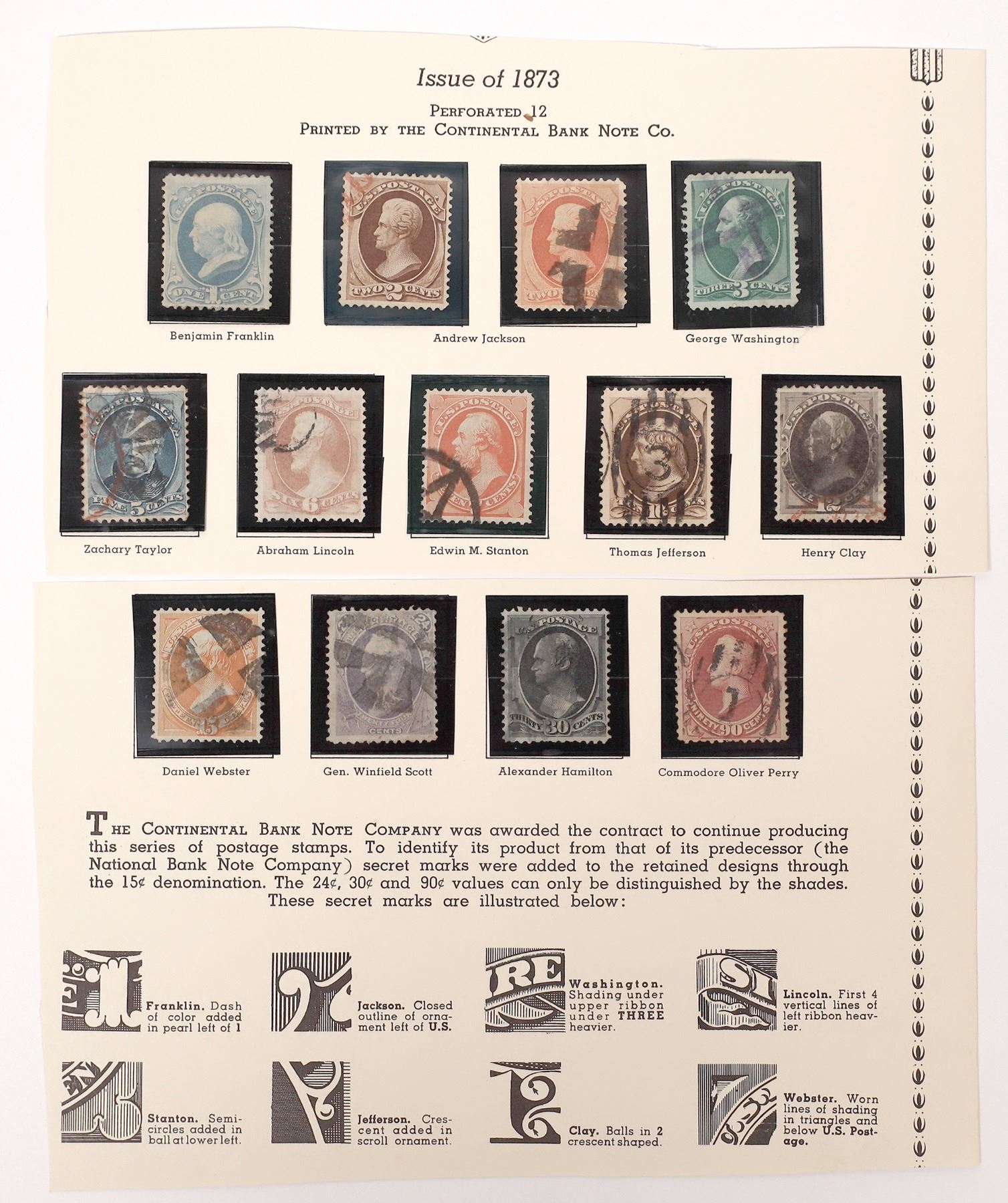 13 stamps, series of 1873 on partial album pages. Mint Scott 156, 157. Cancelled 178, 158, 179, 159, 160, 161, 162, 163, 153, 165, 166. 1c, 2c, 3c, 5c, 6c, 10c, 12c, 15c, 24c, 30c, 90c. Some interesting cancels including X.