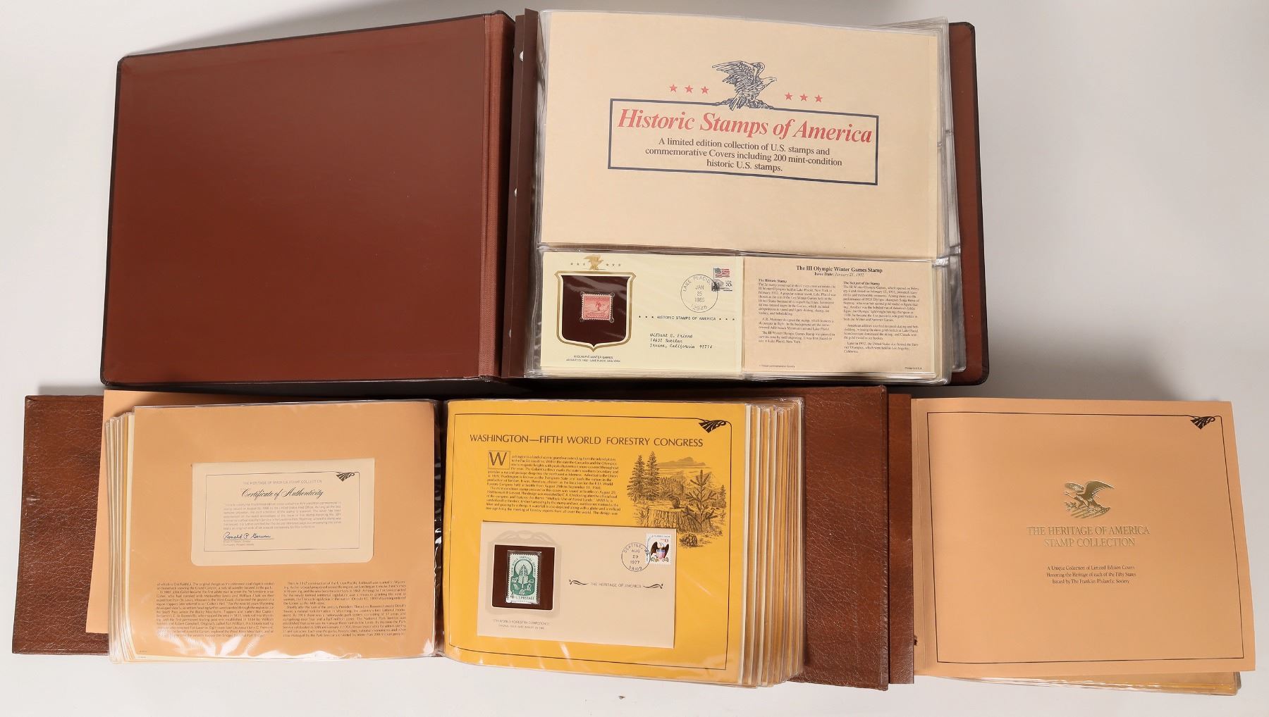 About 200 US stamps on commemorative covers, 1977-85. 2 albums by Franklin Philatelic Society, 1 album by Postal Commemorative Society. About 22 lbs. 1977-85