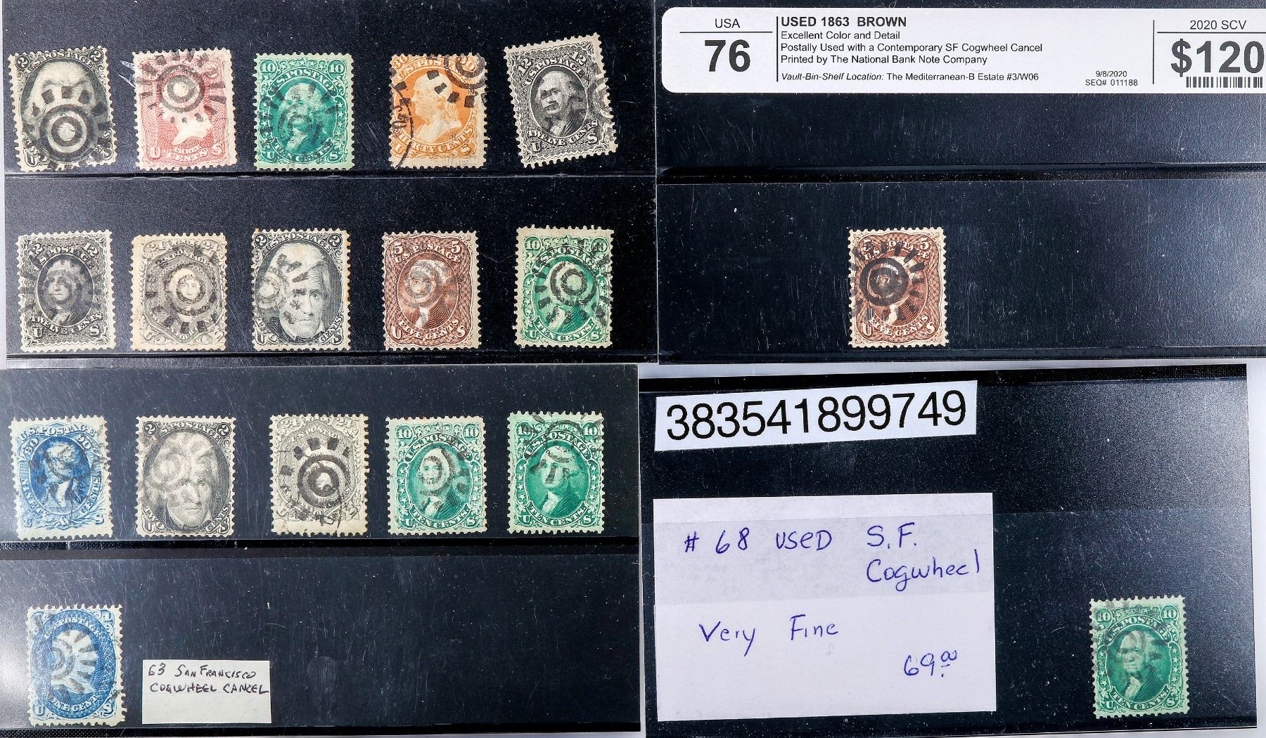 18 US Stamps with fancy cog wheel cancels. #68, 63, 76 and others. 2c, 3c, 6c,10c, 12c, 24c, 30c.