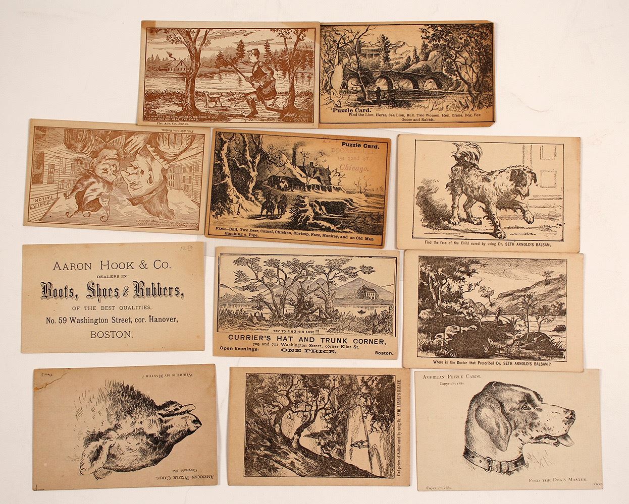 Lot of 11 trade cards that feature illustrative puzzles. Includes: Bates Watchmaker & Jeweler, Currier's Hat & Trunk Corner, Sunday Inter Ocean, Aaron Hook & Co. Boots, Edward B. Stover Boots, Dr. Seth Arnold's Balsam, Gilman Bros. Druggists, etc. (Prag Collection) Date: Location: HWAC# 55667