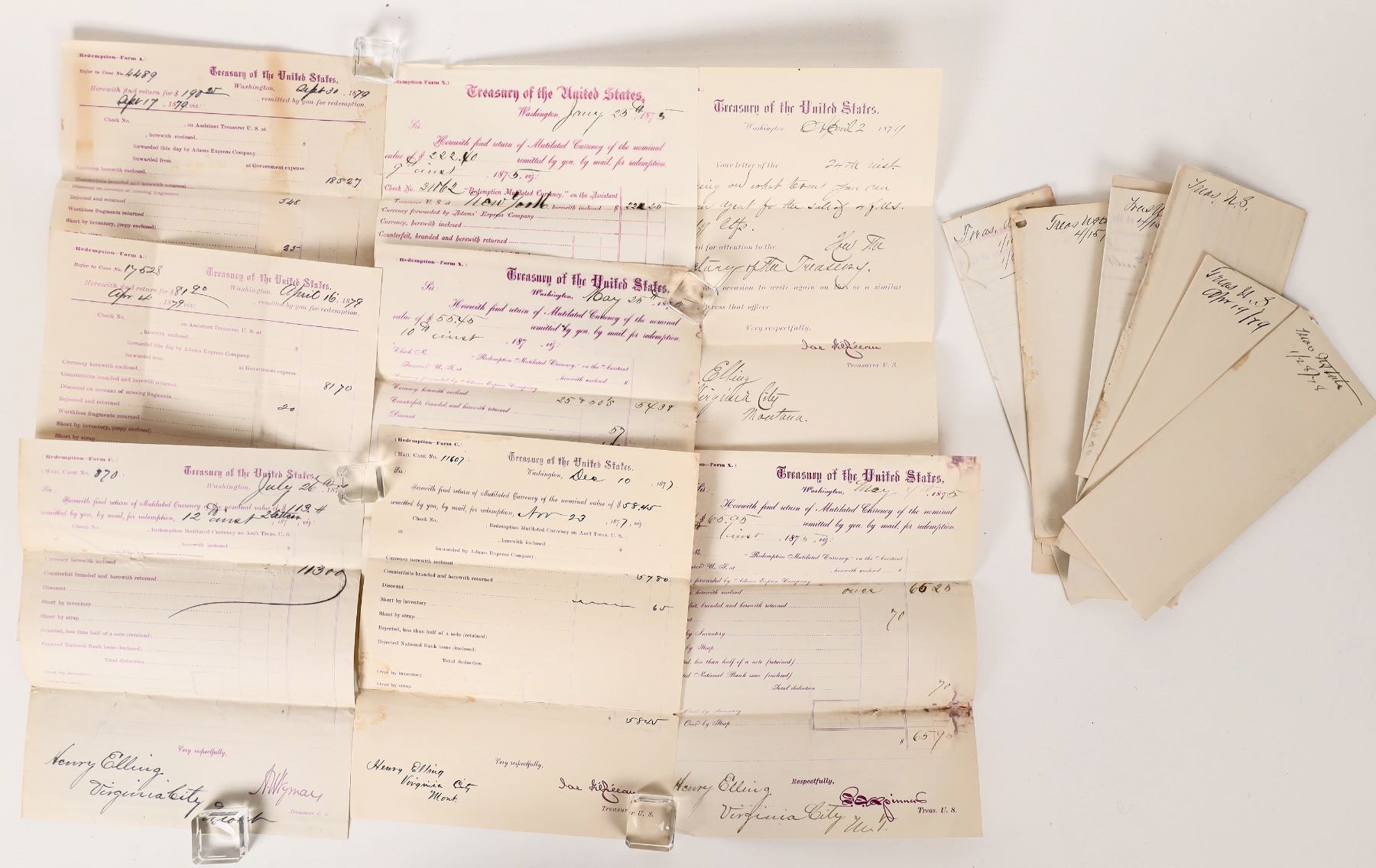 About 18 US Treasury forms for damaged currency. These are records of damaged currency sent to the Treasury Dept. for reimbursement involving Henry Elling in Virginia City, MT. Can you imagine currency making it to Virginia in the 1870's? Montana Virginia City c1870s