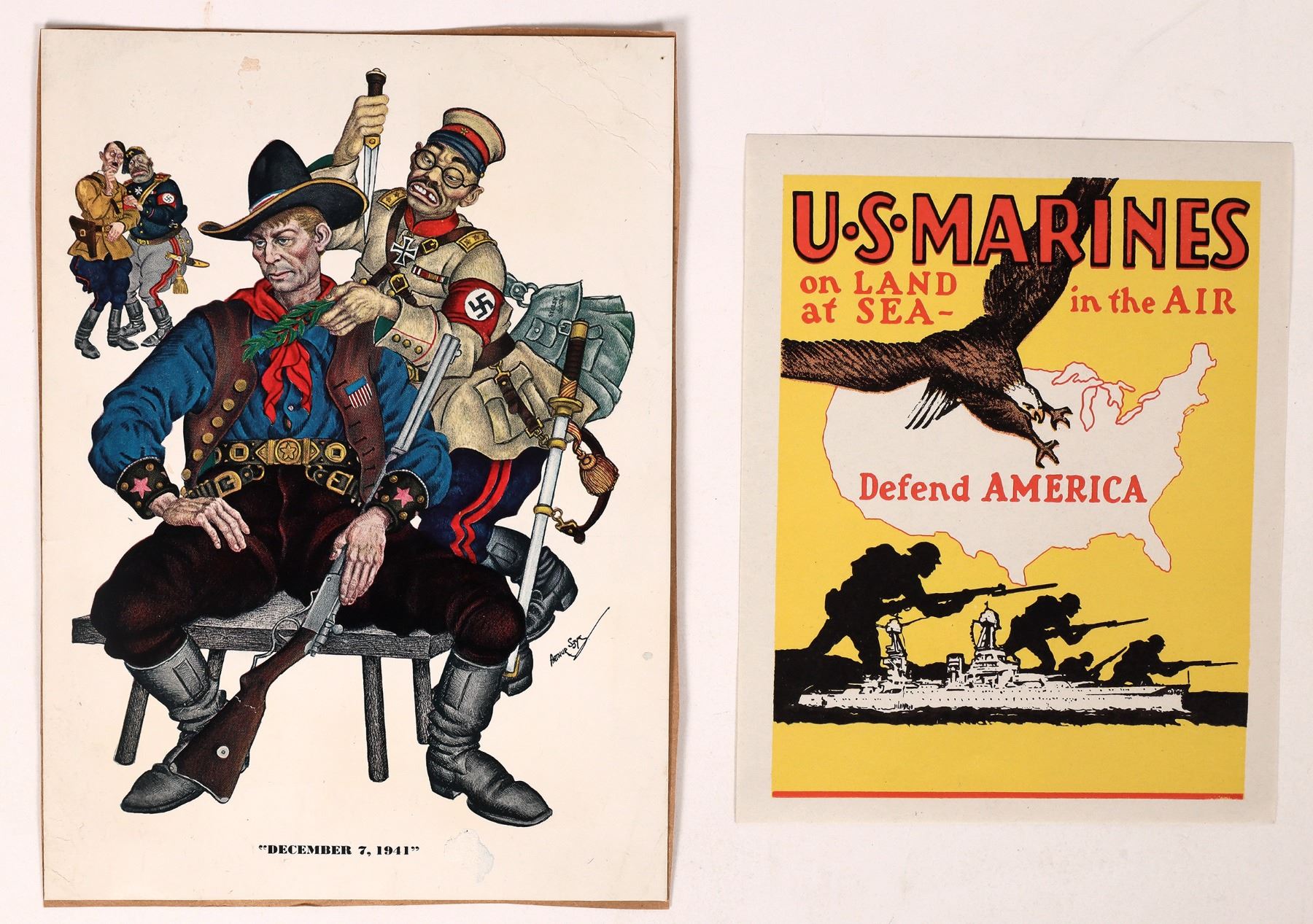 Rare anti Japanese December 7, 1941 caricature of a Japanese soldier stabbing a cowboy with Hitler in the background, 6.25x4.5", mounted on paper backing. WW1? US Marines label, 5x4".