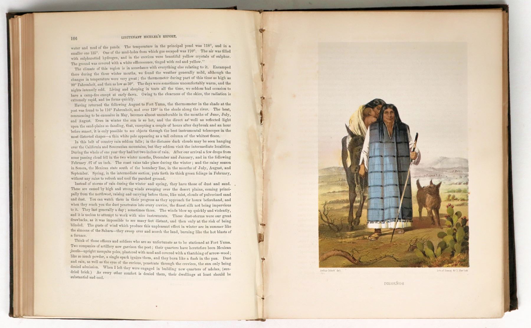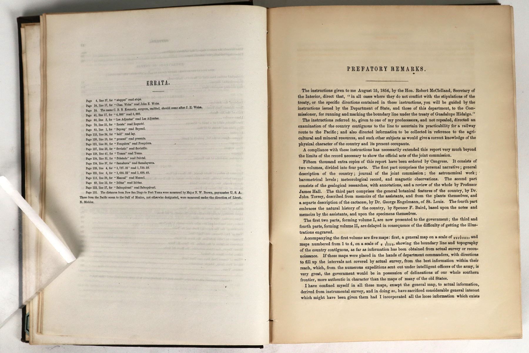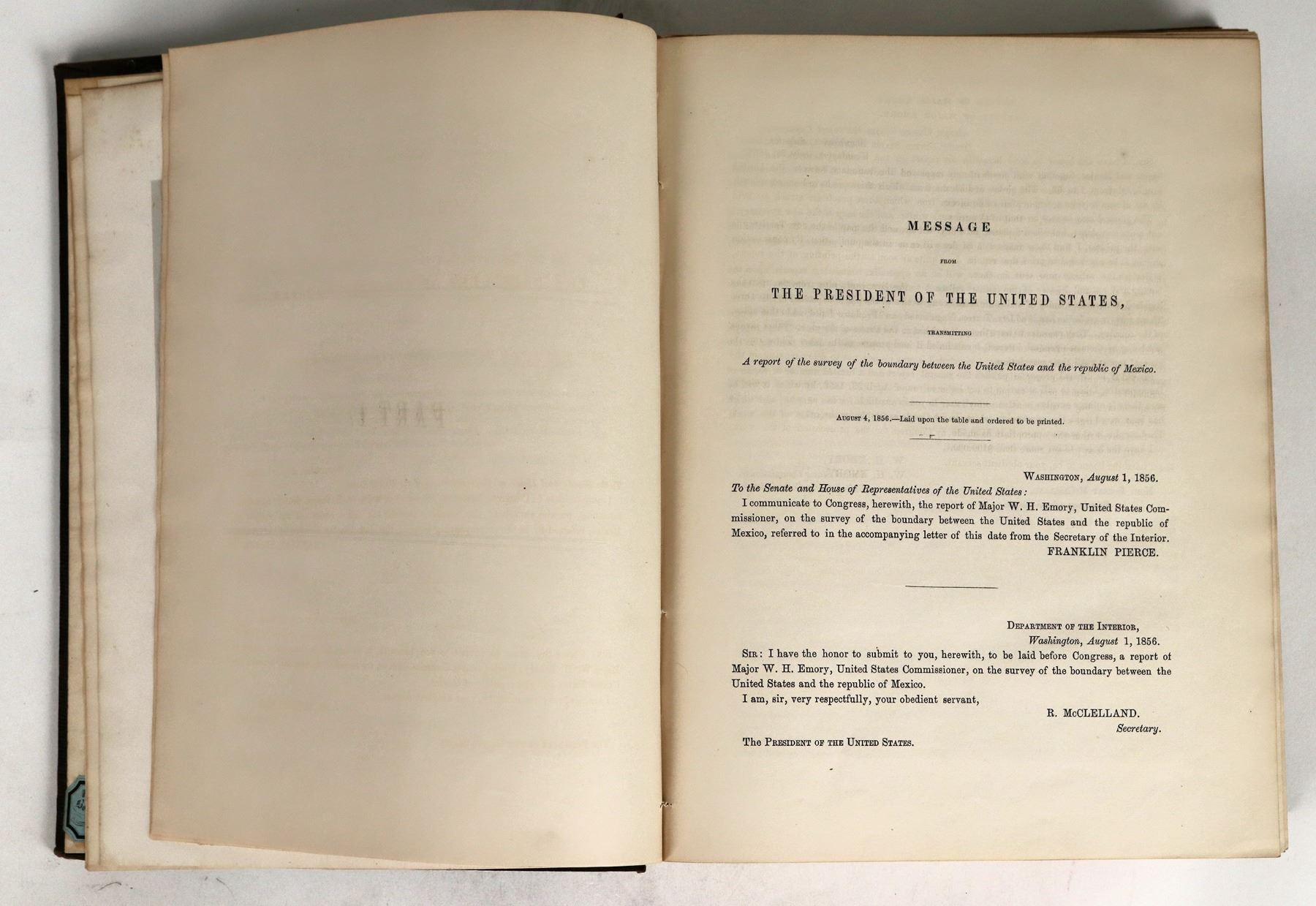 1857 Report of the United States and Mexican Boundary Survey, Made Under the Direction of Secretary of the Interior by William Emory, part 1. Congress funded a full report on this new region as part of the boundary survey. Loaded with illustrations-Old Fort Brown TX, Fort Davis, Roma TX, Fort Duncan Mission of San Jose, Rio Bravo del Norte etc. This important reference also has color plates of Native Americans, foldout maps, buildings, fossils etc. Binding has wear, spine crack, some foxing. Please inspect.