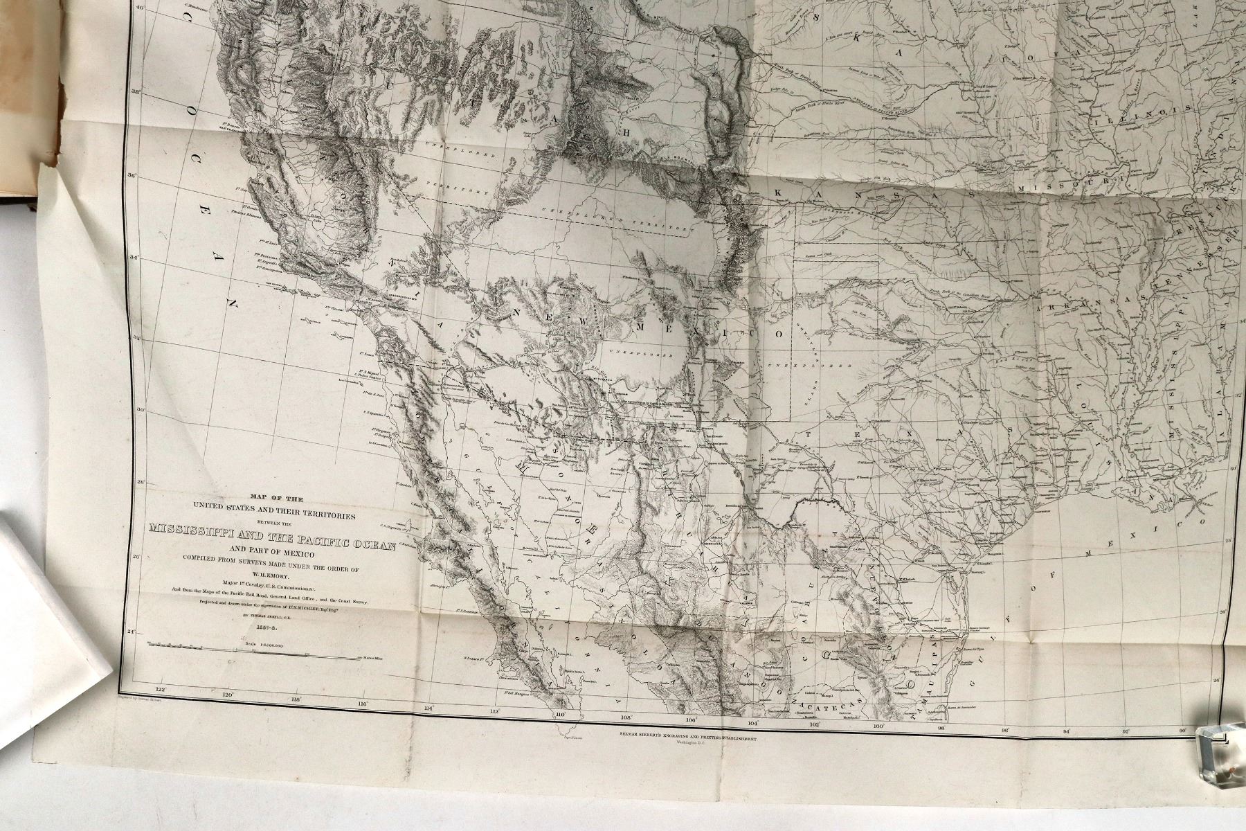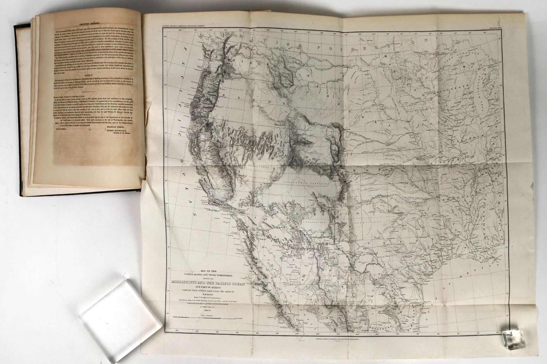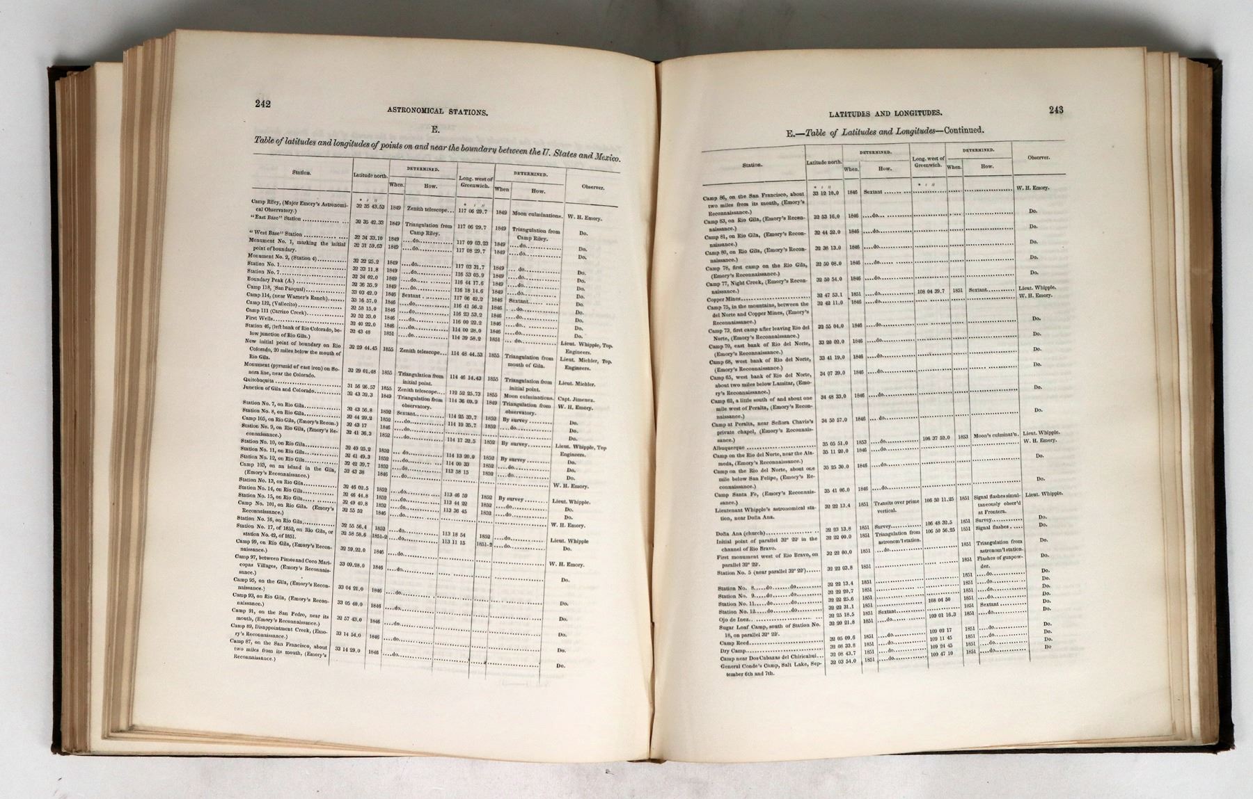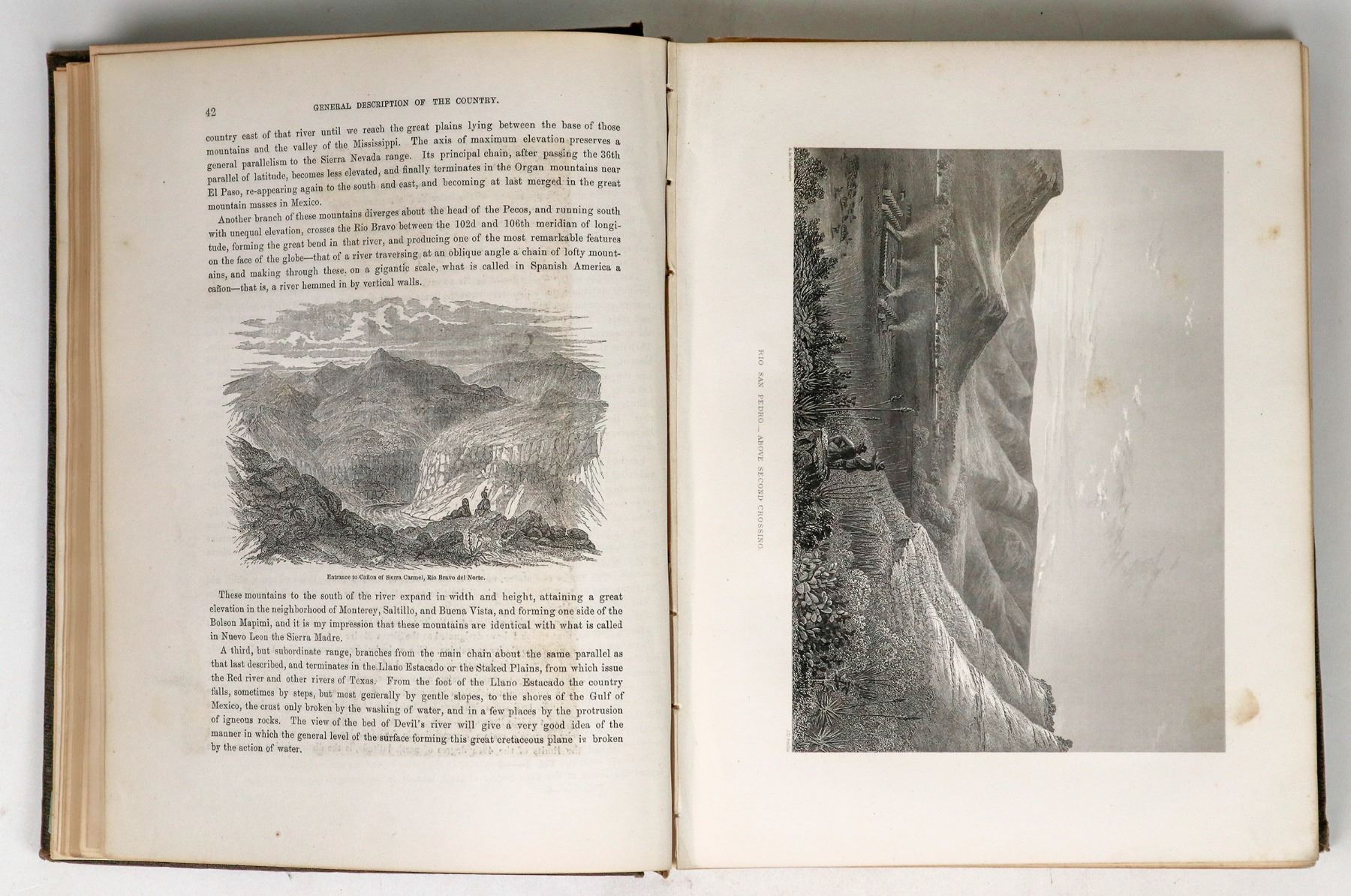 1857 Report of the United States and Mexican Boundary Survey, Made Under the Direction of Secretary of the Interior by William Emory, part 1. Congress funded a full report on this new region as part of the boundary survey. Loaded with illustrations-Old Fort Brown TX, Fort Davis, Roma TX, Fort Duncan Mission of San Jose, Rio Bravo del Norte etc. This important reference also has color plates of Native Americans, foldout maps, buildings, fossils etc. Binding has wear, spine crack, some foxing. Please inspect.