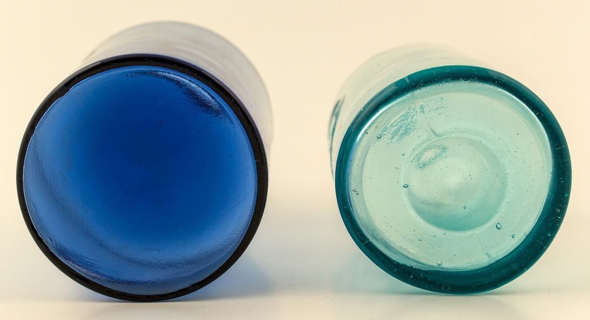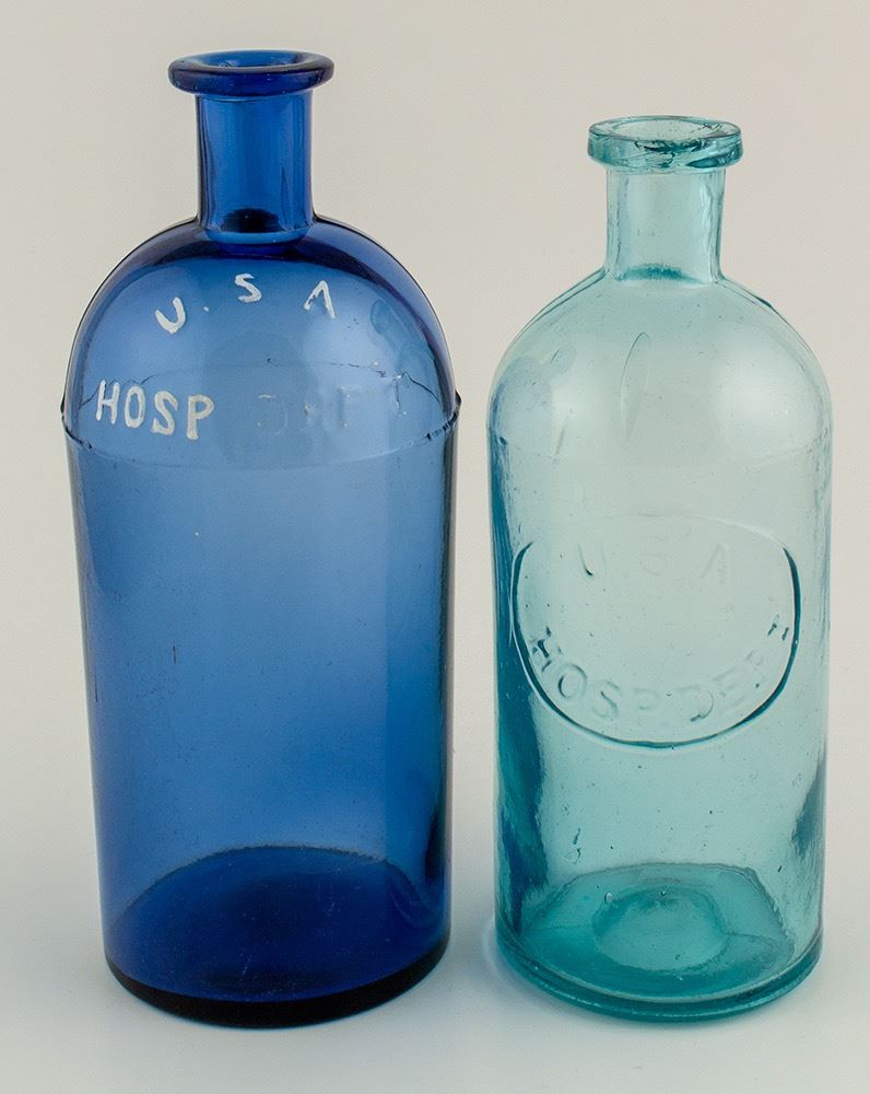 Pair of USA Hospital Department bottles. The first is a gorgeous medium cobalt with embossing on the shoulder, height 7.25". The second. Is aqua, 7" tall, embossing inside of an oval slugplate. The cobalt bottle is a three-piece mold. The aqua bottle is a four piece mold. No makers mark on either bottle. The USA Hospital Department bottles are thought to have been made during the Civil War and used perhaps through the early 1870s. They are among the most popular of American medical bottles because of the wide variety of beautiful colors. City: State: Inventory Number: 38950