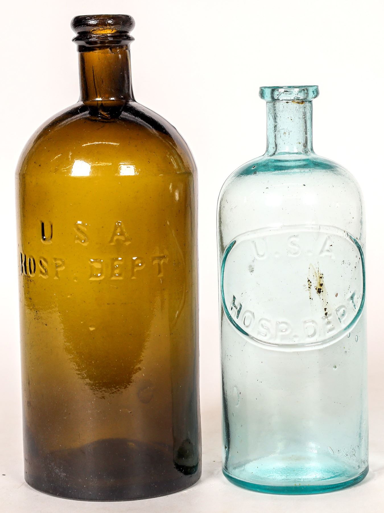 Two of the classic USA Hospital bottles. These are some of the most colorful and highly collected bottles of their genre. 1" dark olive green, 9" tall, appears problem free. Double ring collar. 2) aqua, USA Hospital Dept in oval raised broder slug plate, 8" tall, single broad lip. Appears problem free. Ron Reed Collection.