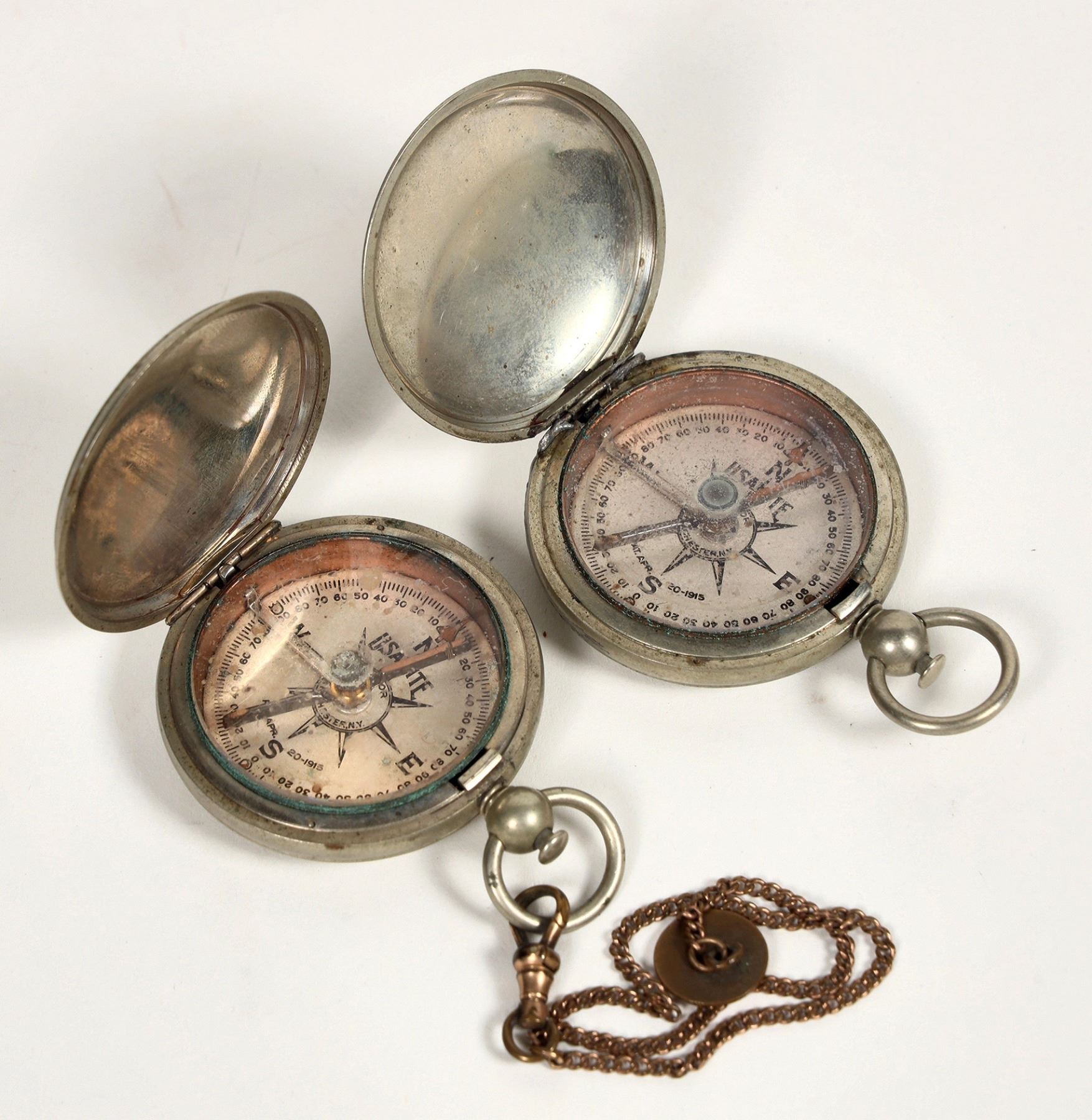 These are two USANite compasses "Eng. Dept. / U.S.A." (1917 and 1918). Both compasses have spotted lenses. WW1 issued tools. One is with a brass chain. In working order good condition without dents. Please see photo for details.