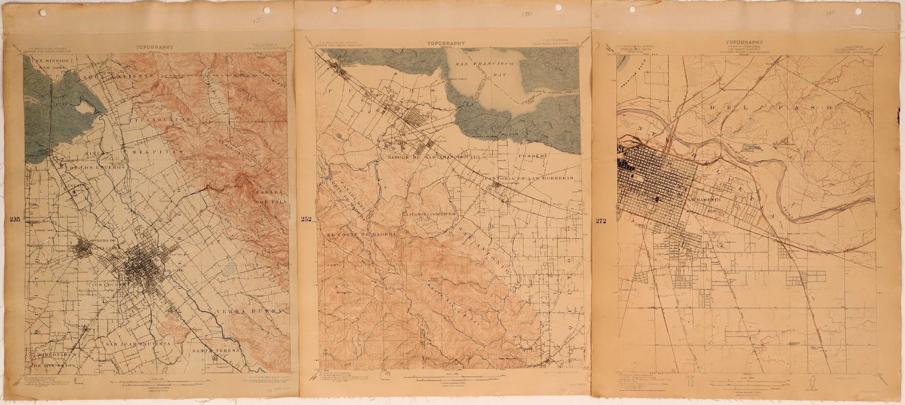 1) 1908-09 Sacramento County Brighton Quadrangle USGS George Otis Smith, Director. From June 1911 Edition. 2) 1895 Palo Alto Quadrangle From May 1899 Edition. 3) 1895 San Jose Quadrangle From March 1899 Edition. All removed from book. Condition good for age.
