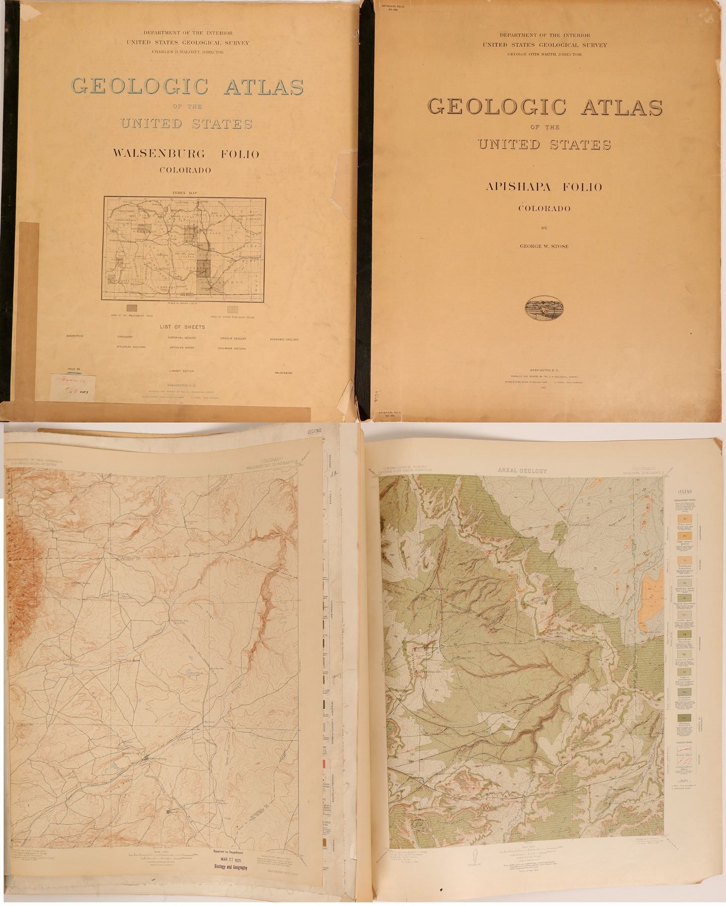 Geologic Atlas of the U.S. Apishapa Folio by George W. Stose, 1912 and Walsenburg Folio Library Edition 1900. Complete folios. Condition consistent with age.
