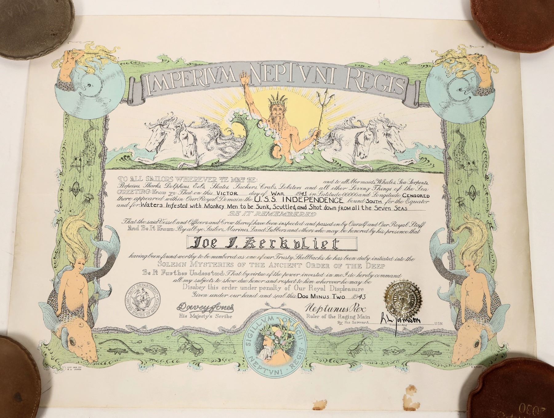 An unusual mock document from USS Independence, issued when a new seaman crosses the equator for the first time on the ship. Signed by Davey Jones and Neptunus Rex. 16x20". Lower left crease and bottom brown spots, please inspect.