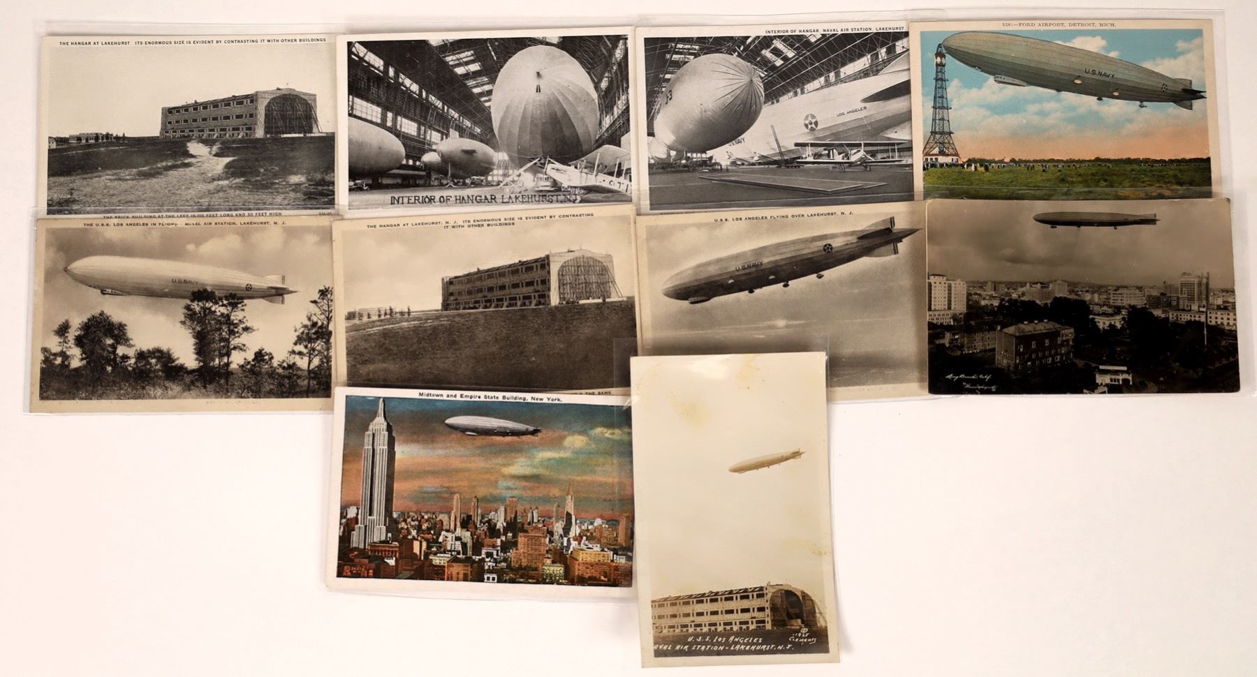Lot of 10. None are postmarked. Five RPC’s: ground view perspective. Los Angels flying over Long Beach, Ca., over NAS Lakehurst N.J. (1925), Hangar @ Lakehurst NAS. Interior of Hangar w/ blimps and the Los Angeles, color litho of USS Los Angeles flying over New York, aerial view. Protective sleeves.