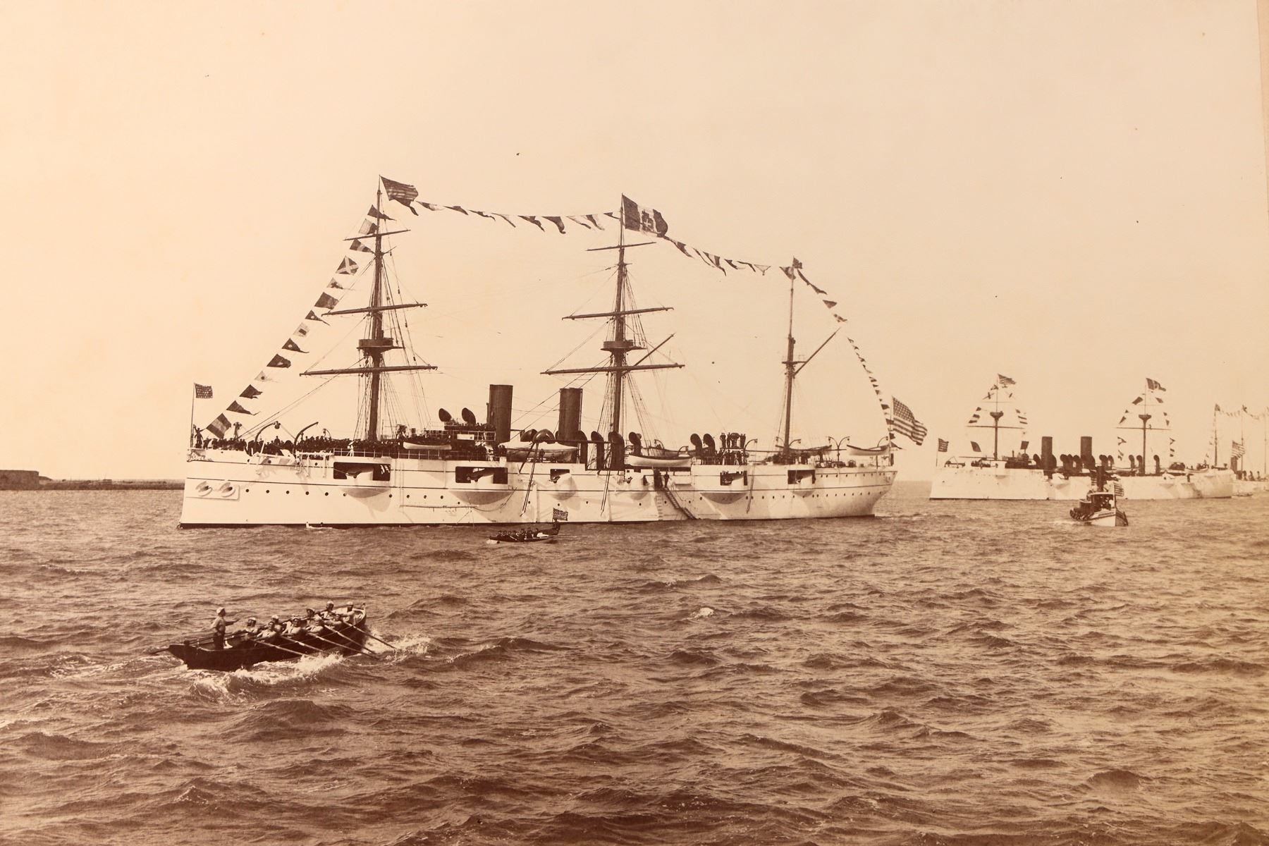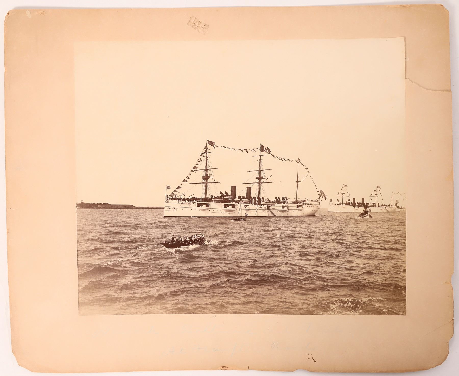 USS Newark in Baltimore Harbor photo measuring 10"x 12" attached to a 13"x 16" board. The first USS Newark (C-1) was a United States Navy protected cruiser, the eighth protected cruiser launched by the United States. In design, she succeeded the "ABC" cruisers Atlanta, Boston, & Chicago with better protection, higher speed, & a uniform 6-inch gun armament. The backing board has some rough edges, but photo is in nice condition. Please see photos for more details. [Baltimore Maryland