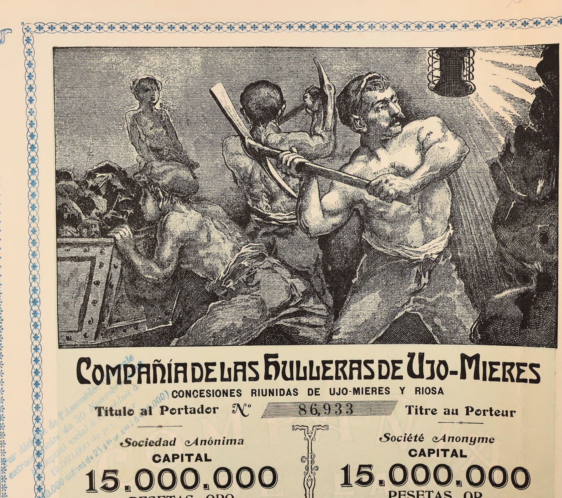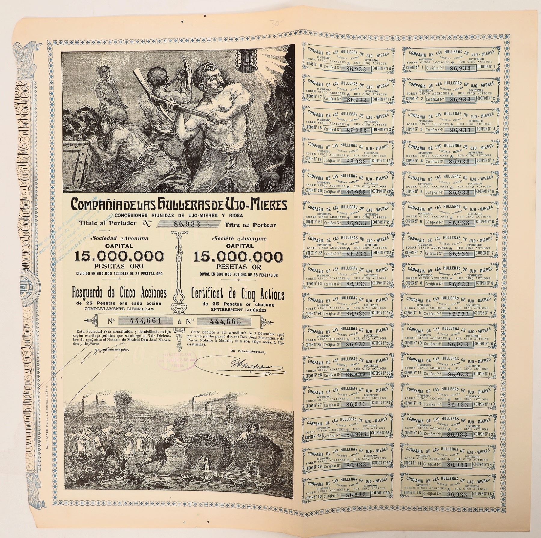 Ujo-Mieres Coal bond, 1904. Located near Santa Cruz. 2 choice European mining vignettes.[ Mieres Spain