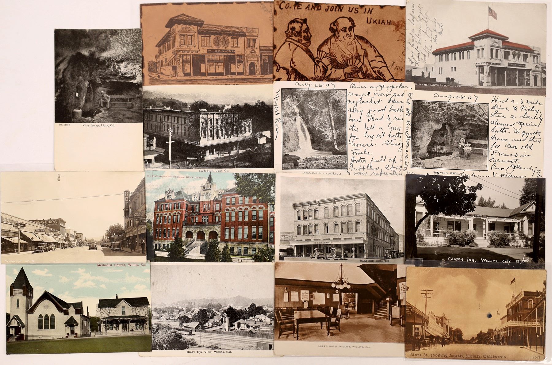 Lot of 15. Includes two leather postcards, a front and back advertising postcard for Willits Mercantile and a B&W RPC with great definition of downtown main street c1930's. Also, buildings, sketch birds eye view, Carson Inn, Palace Hotel, Vichy Springs, Vichy Falls, Cecile Hotel in Ukiah.