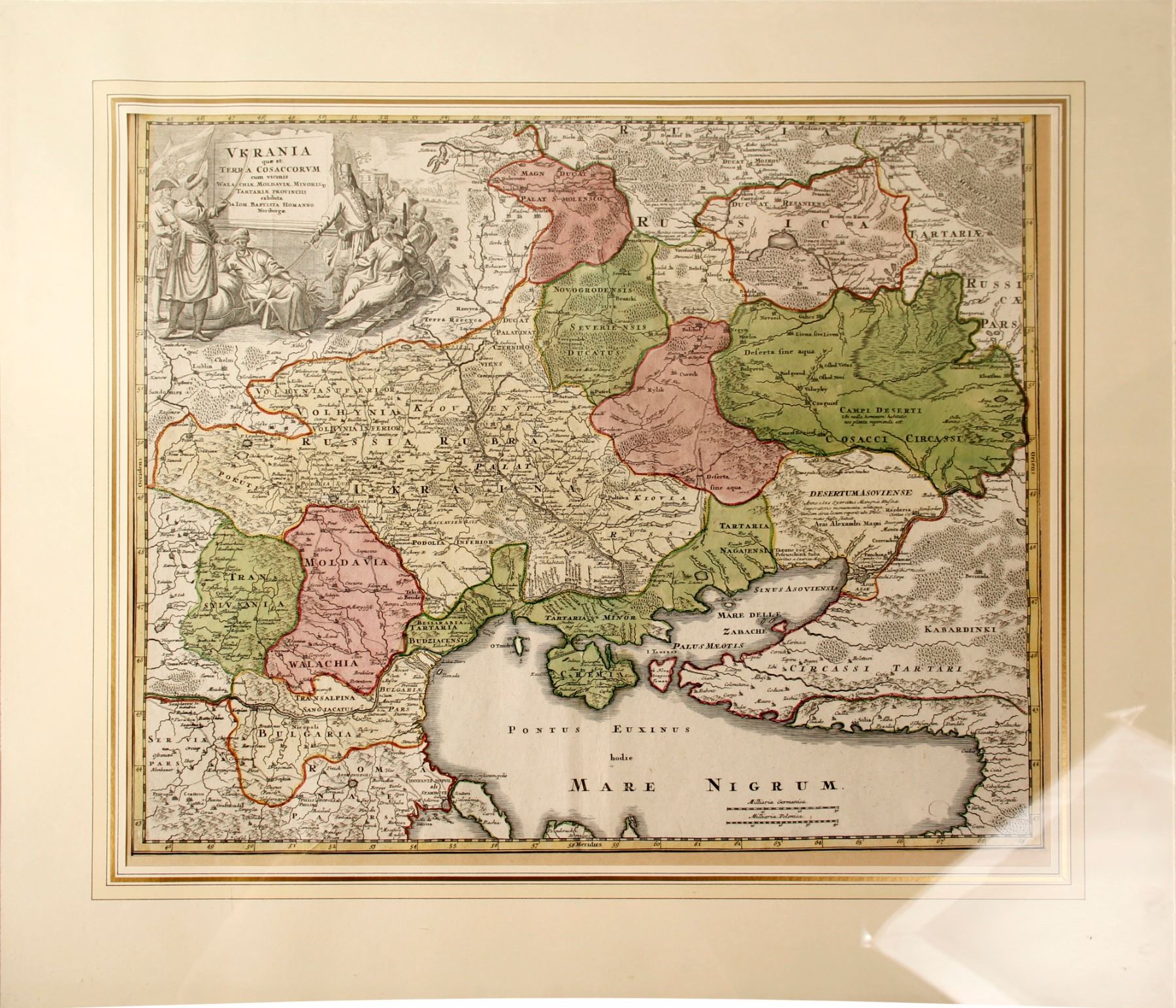 Ukrania quae et Teira Cosaccorum loh Baptista Hermanno, Noribergae cum Vicini Wala Chiae, Moldavae, Minoris, Tartariae, Provinciis. Published by Homanno, the best map maker in Germany, and undoubtedly one of the best in the world at the time. Undated, the piece is thought to have been published in 1720. 19 x 23", matted w glass, but no frame. State: City: Date: HWAC# 84866