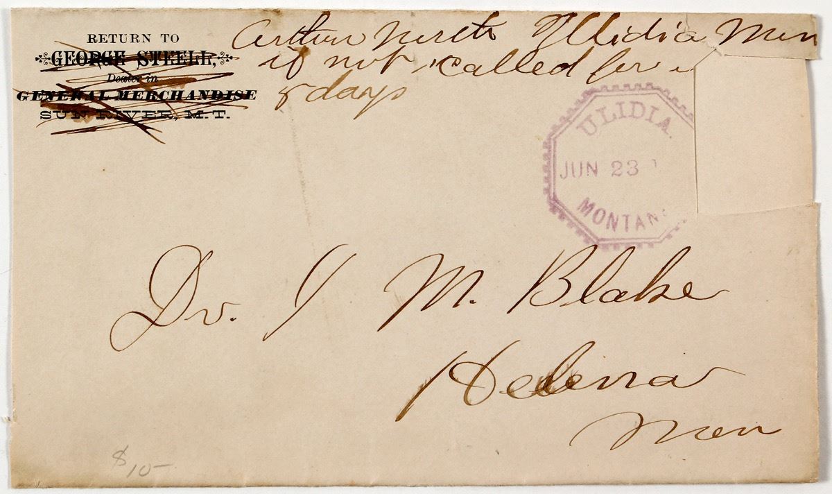 Post office opened from 1880 to 1885. Magenta octagon ridged cancel. Nice strike. Stamp has been removed. Corner cover of George Steell, General Merchandise, Sun River has been crossed out. To Dr. J. M. Blake. City: Ulida State: Montana Date: c1884 ID: 36826