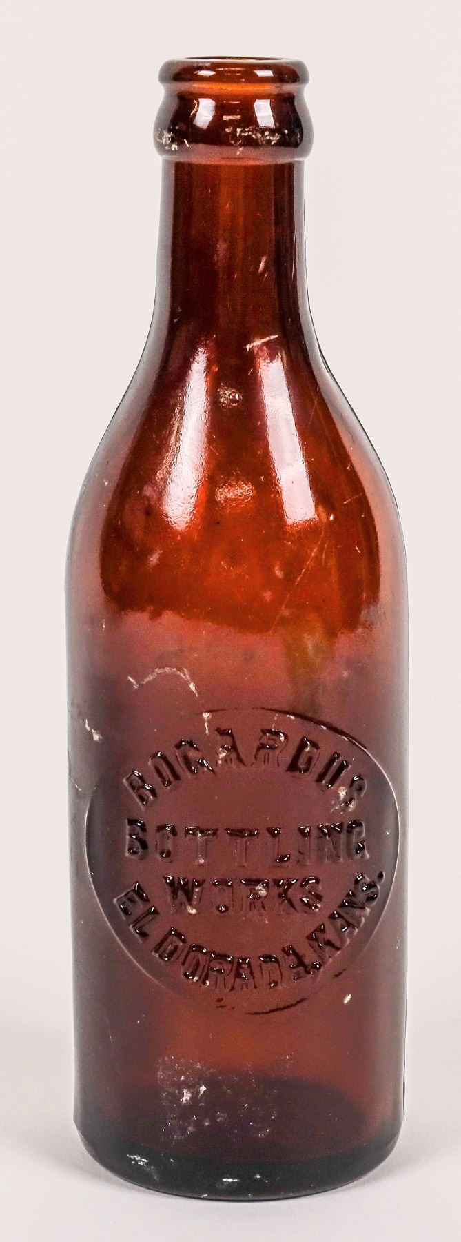 Bogaradus Bottling Works, El Dorado, Kans. This appears on front of bottle and on the bottom of the bottle. The Bogaraus family arrived in in El Dorado in 1877 and established a business there at 216 West Central. They eventually moved to Osawatomie and opened a company there. Issues include scratches and other marks. Overall nice. El Dorado is located in the heart of an oil, gas, livestock and farming region. Today about 10,000 call it home.