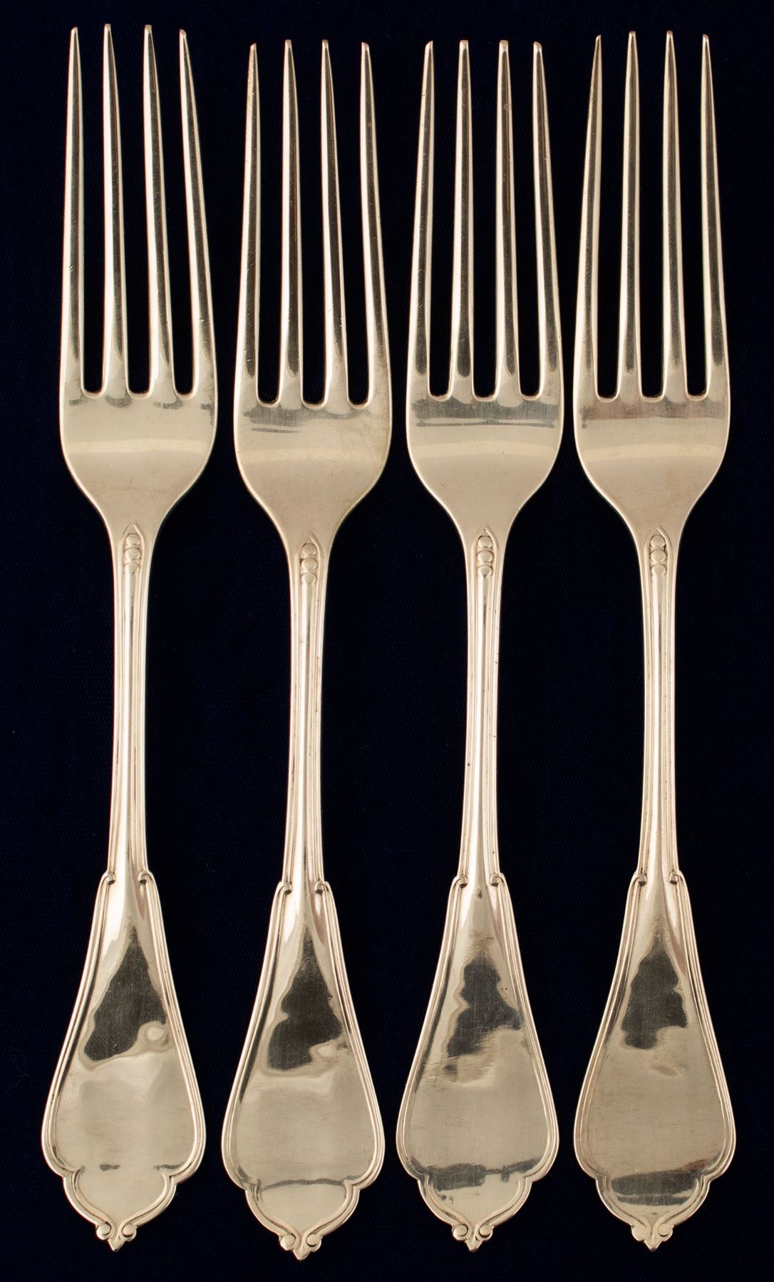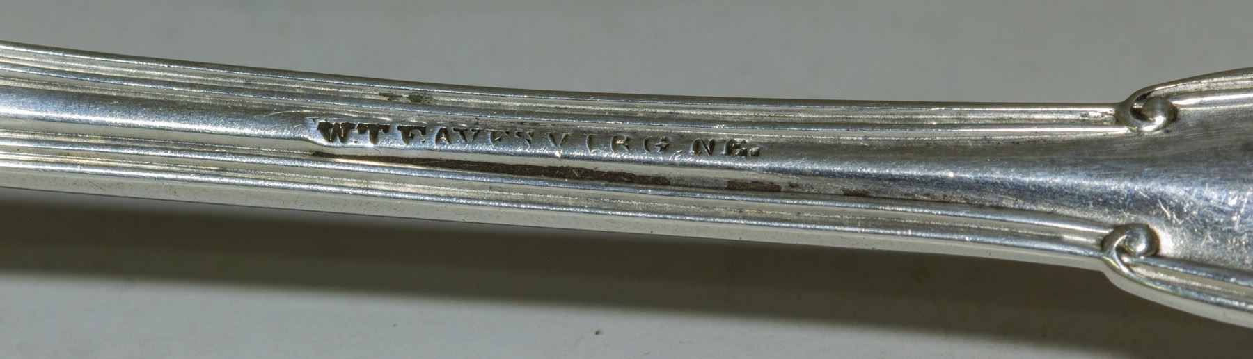 This marks the second time we've been able to offer the very rare Eaves silver. We offered the discovery piece about a year or two ago, a single piece found in a local silver collection. This group consists of four dinner forks. There are thus only five known pieces to us and our advanced Nevada silver collectors. Eaves was a silversmith in Sacramento circa 1860 (Eaves & Nye), and may have moved up to Virginia City shortly after. He may have started the jewelry and silver business that later became M. M. Frederick. Nye came in shortly after. c1862-1865. State: Nevada City: Virginia City HWAC#: 49152 Date: