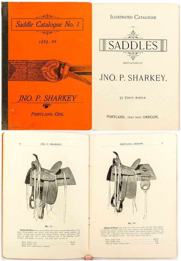 John P. Sharkey was the son of a harness maker from Wheeling, West Virginia. He arrived in Portland in 1886 where he was a boilermaker, and grocer. In 1895 he began the manufacture of saddles. He was only in business for about 8 years. Despite this short tenure he was noted as successful in inventions of appliances for both eh saddle and harness. This is reported to be the earliest Saddle Catalog from a Portland Saddle Maker! It is also reported to be the first in the U. S. to use the half-tone process within a catalog. [The Early Saddle Makers of Portland, Oregon by Richard & Dorothy Egan]. Signature on back is that of a rather noted saddle maker from Condon, Oregon named John Reisacher. This is either his signature or at least evidence that it was his personal copy. Several items from the Reisacher estate have surfaced in recent years. Complete. 4 pages. State:Oregon City:Portland Date:1898 ID# 49706