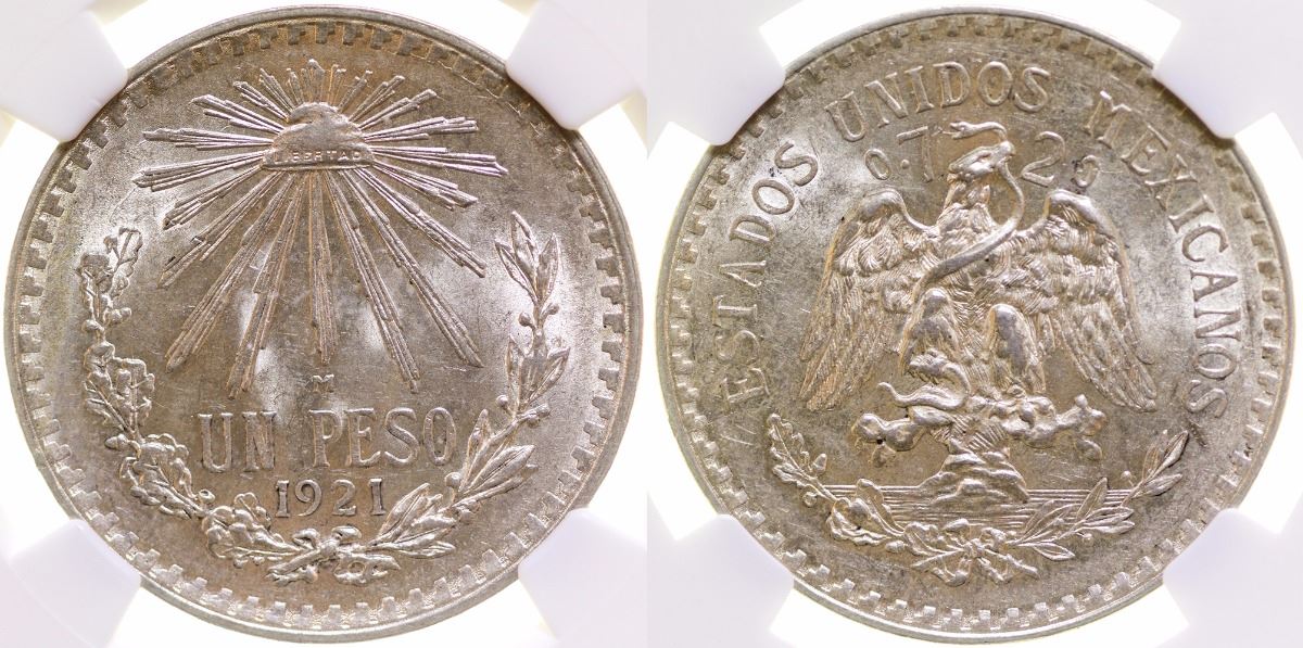 KM # 455, .514 oz. silver, .720 fine, 34mm. MS 62. State: Mexico City: Date: 1921 FHWAC#: 41877