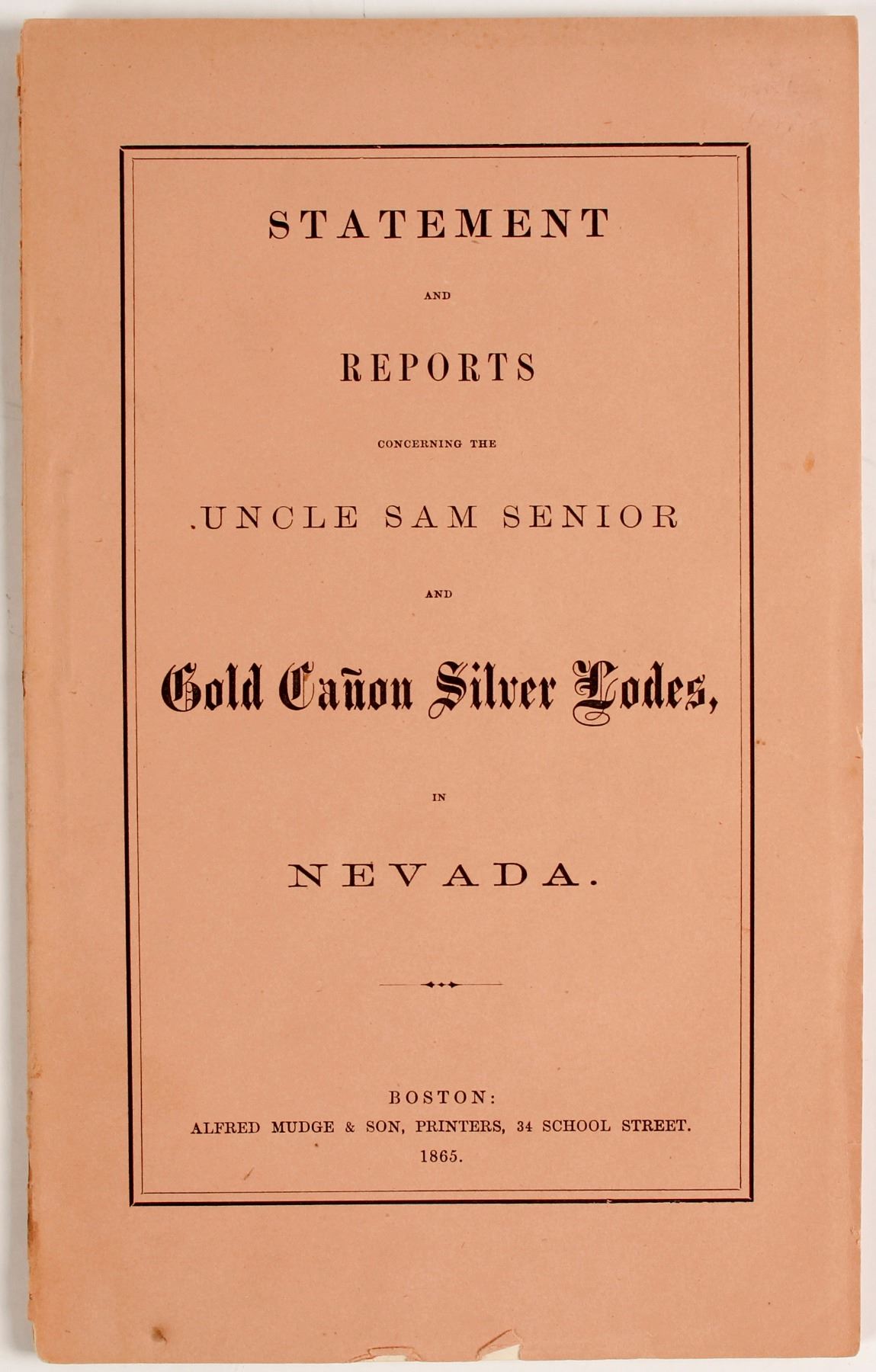 Statement & Reports concerning the Uncle Sam Senior and Gold Canon Silver Lodes in Nevada. Printed by Alfred Mudge & Son, Boston, 1865. The mines were surveyed in 1865. A good copy sans the map.