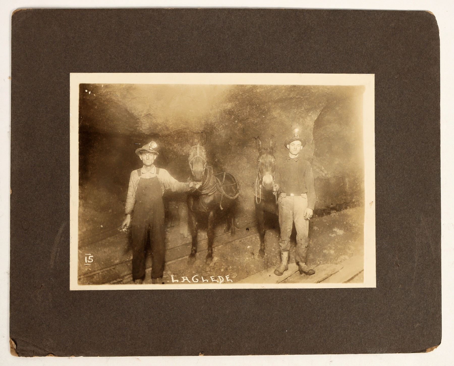 This is a fantastic underground scene with two miners and two burros. 5 x 7" photo on 8 x 10" mount. When Fred Holabird saw it, he thought of this song: "My sweetheart is a mule in the mines/ I Drove her without any lines / on her bumper I sit / as I chew & I spit / all over my sweetheart's behind." We believe this was shot using a magnesium flash given that it was bright enough for one of the miners to close his eyes. Labelled "Laglede" We found a Vandalia, Missouri 1916 article mention a LaGlede Mine. No photographer listed.