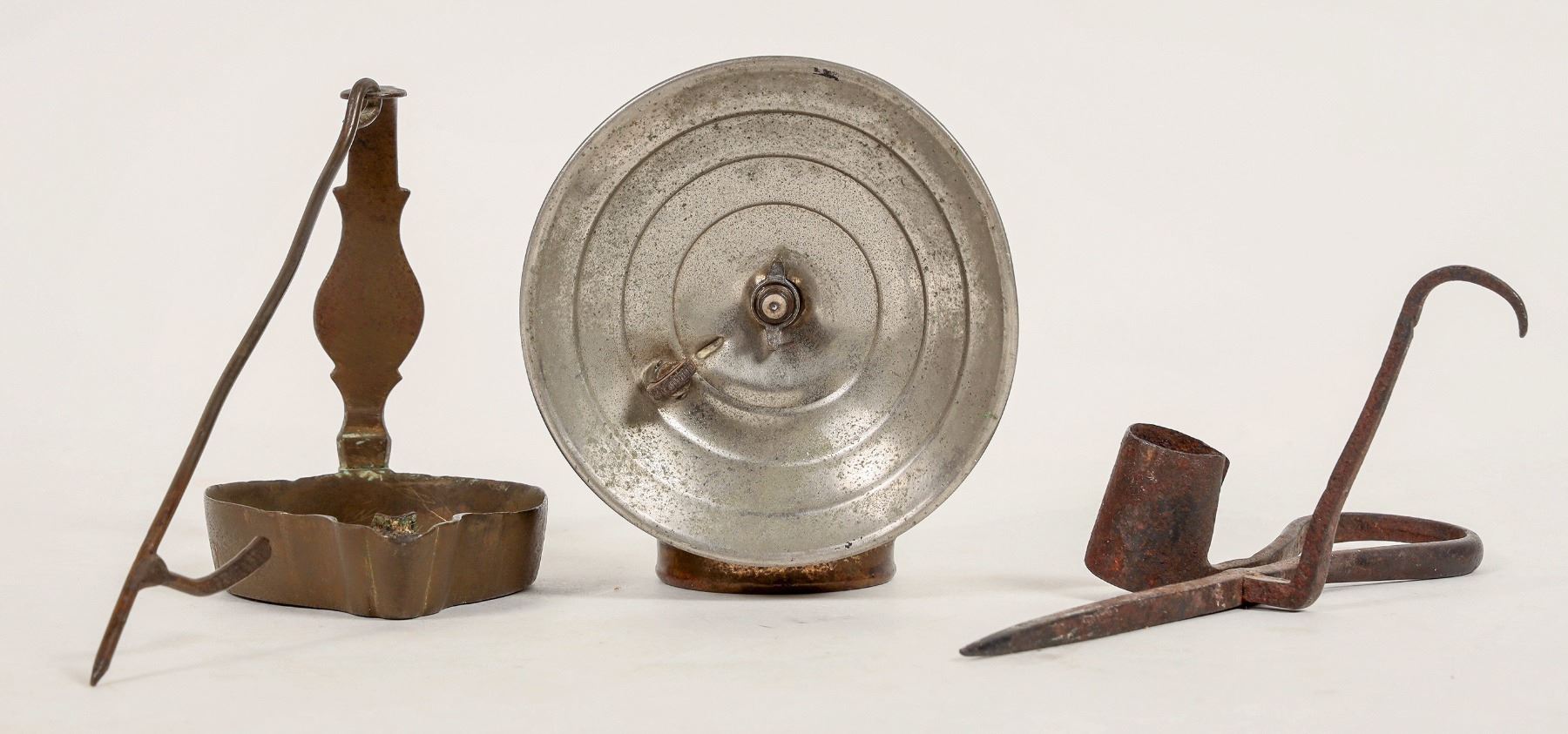 Underground mining lights. Auto Lite carbide, 7" candle stick holder and brass cup with spout and hanging hook. Noel Kirshenbaum Collection. [