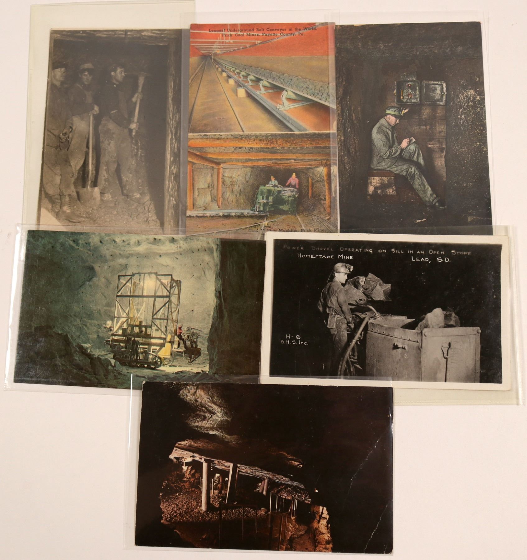 5 b/w and 1 color postcards of underground mining views. Postcard showing lodging room in the copper mine at Old New-Gate Prison where convicts were held at night 30 feet under ground. Another postcard had longest underground belt conveyor in the world at the Frick Coal Mines, Fayette County, Pennsylvania another postcard shows the salt mine on Jefferson Island in Near New Iberia, Louisiana with a 70' pillar of salt supporting the ceiling.